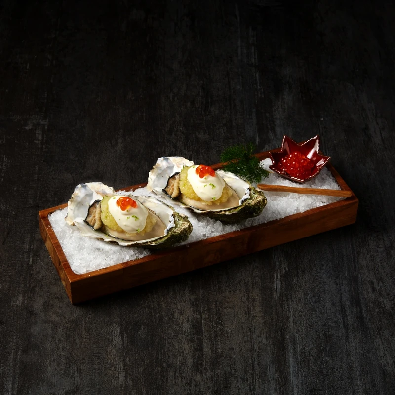 金箔紅玉生蠔以珠寶盒概念集結數種海鮮食材,選用來自熊本的生蠔,搭配鮭魚肉、鱒魚卵、海膽、魚子醬及金箔點綴,入口滿滿鮮甜海味超享受。