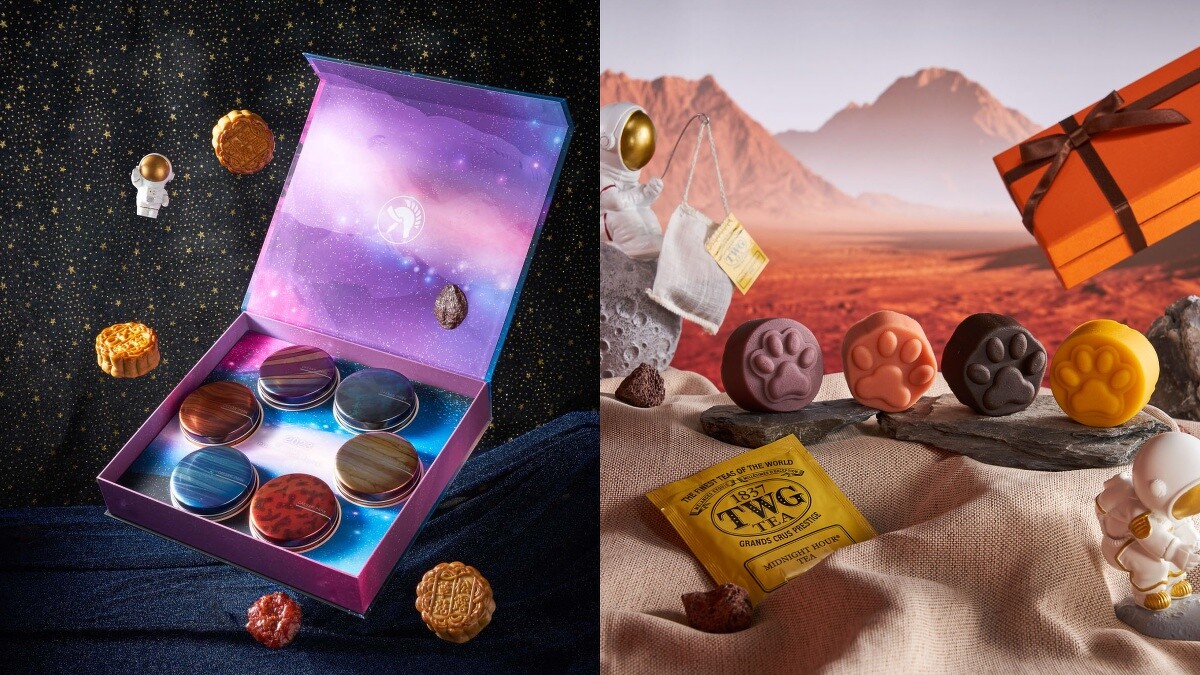 凱撒飯店連鎖今年推出兩款極具話題的禮盒,廣式經典「星球派對」禮盒以宇宙外太空為主角,在馬口鐵盒中裝有蓮蓉蛋黃、極品XO海鮮、松露蕈菇及芋泥肉鬆等口味,另外更搭配「極品圓燒烤豬」及「極品圓燒烤牛」兩款肉乾,月餅、烤肉一次享有!另外還有承襲去年超可愛「肉掌」造型的「茗月流芯」禮盒,奶黃起司、芋頭奶黃、特濃巧克力等三種流芯口味及荔枝覆盆莓,搭配TWG TEA「英式早餐茶」及「午夜時光」茶包,為賞月時光解膩!售價780~1580元。
