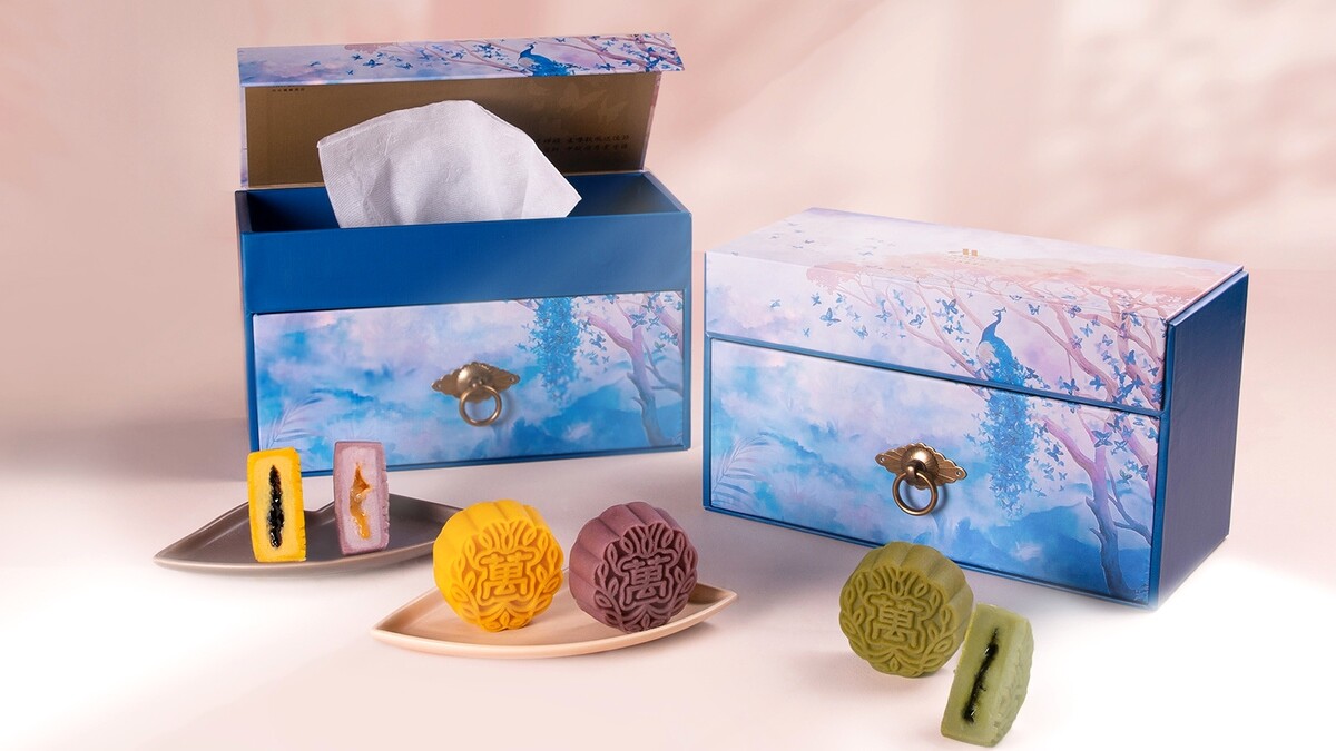 有著絕美裝潢設計的台北萬豪酒店,現在把大廳迎賓壁畫《蝶雀呈祥》作為中秋節月餅禮盒靈感,首推「萬月」流芯月餅禮盒,能看到阿里山晨曦雲霧背景、台灣特有鳳蝶、藍鵲與孔雀悠游雲海,內含芋頭奶黃流芯、香橙巧克力流芯、金萱芝麻流芯等3種口味,並用掀蓋式設計,過完節慶後還能作為面紙抽取盒、收納盒,既環保又好用,售價1180元。