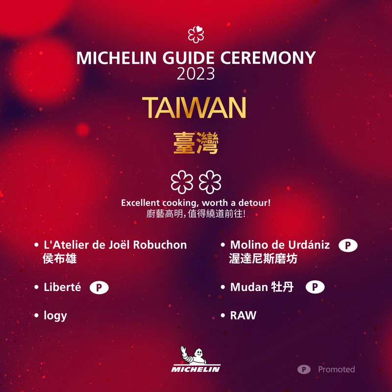 若從台北、台中、台南、高雄等不同地區來看,台北、台中兩家餐廳晉升3星,使全台灣現在擁有三間3星餐廳!台北的渥達尼斯磨坊、牡丹則晉升2星,獲得2星肯定的餐廳總數達到6家。另外還有5家餐廳:A Cut、Ad Astra、斑泊、INITA、ZEA獲得一星肯定,獲得1星餐廳總數達到28 家。