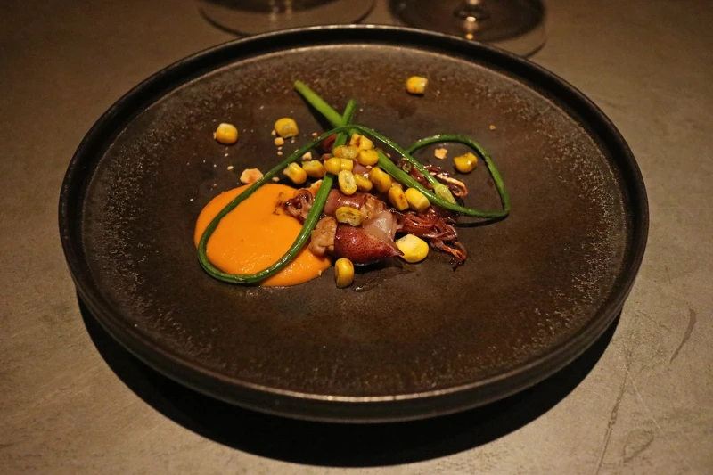第二道料理選用日本九州的瑩烏賊以龍眼木窯烤,搭配上炙烤去皮、番茄、大蒜與堅果、酒醋製成的紅椒醬(Romesco),一旁則是直火烤過的韭菜花、甜玉米與榛果碎,香氣飽滿的醬汁佐上瑩烏賊絕妙的搭配,加上堅果的油脂香氣與海味做了完美的搭配。