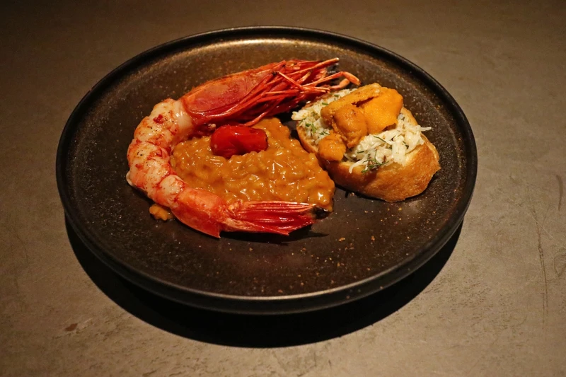 胭脂蝦蟹肉番茄燉飯使用西班牙米 Bomba Rice 與窯烤番茄熬製,獨有的濃郁香氣包裹著飽滿的米粒,一旁則是直火燒炙過的胭脂蝦,呈現了恰到好處的熟度,食用時還能取用頭部蝦膏澆淋在燉飯上頭一起享用;烤法棍上則堆疊上蒔蘿蟹肉、北海道赤海膽,最後以來自台南佳里的野生烏魚子串連起盤中所有鮮味,滿口海味將隨著每一次咀嚼迸發開來。