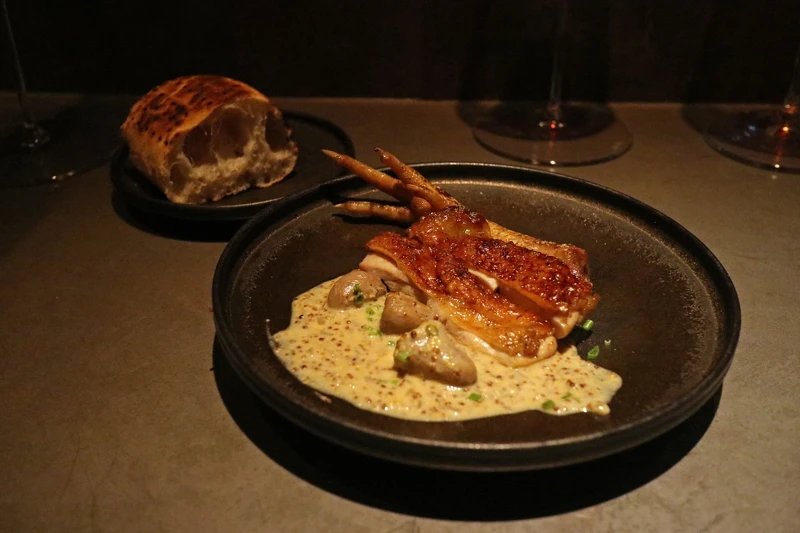 此為主廚的招牌菜色,選用法國知名的品種薩索雞(Sasso),在雲林以穀物、玉米飼養90至100天,在風乾熟成2~3天後才能開始料理,主廚以炭火上下炙燒,因此整體香氣濃郁,熟成後濃縮了雞肉的風味吃來皮脆肉嫩,且帶有豐富的油脂香氣。搭配上的則法式芥末籽醬,以及主廚現場大火熱炒的充滿鑊氣鮮嫩多汁的雞心,再以蝦夷蔥的清香作為畫龍點睛的點綴。