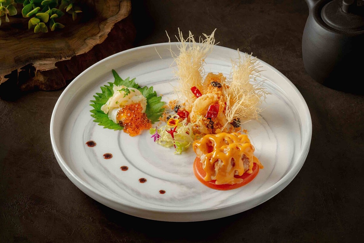 這道料理結合了「川」「粵」風味的特色,特選肉質鮮甜飽滿的老虎蝦,將其蝦身仔細地裹上滿滿的蝦漿,再將其下鍋油炸至金黃酥脆後,淋上香麻的四川醬汁,精心調配出甜、酸、辣、香等多重風味,飽口彈牙的蝦肉,讓人回味無窮。