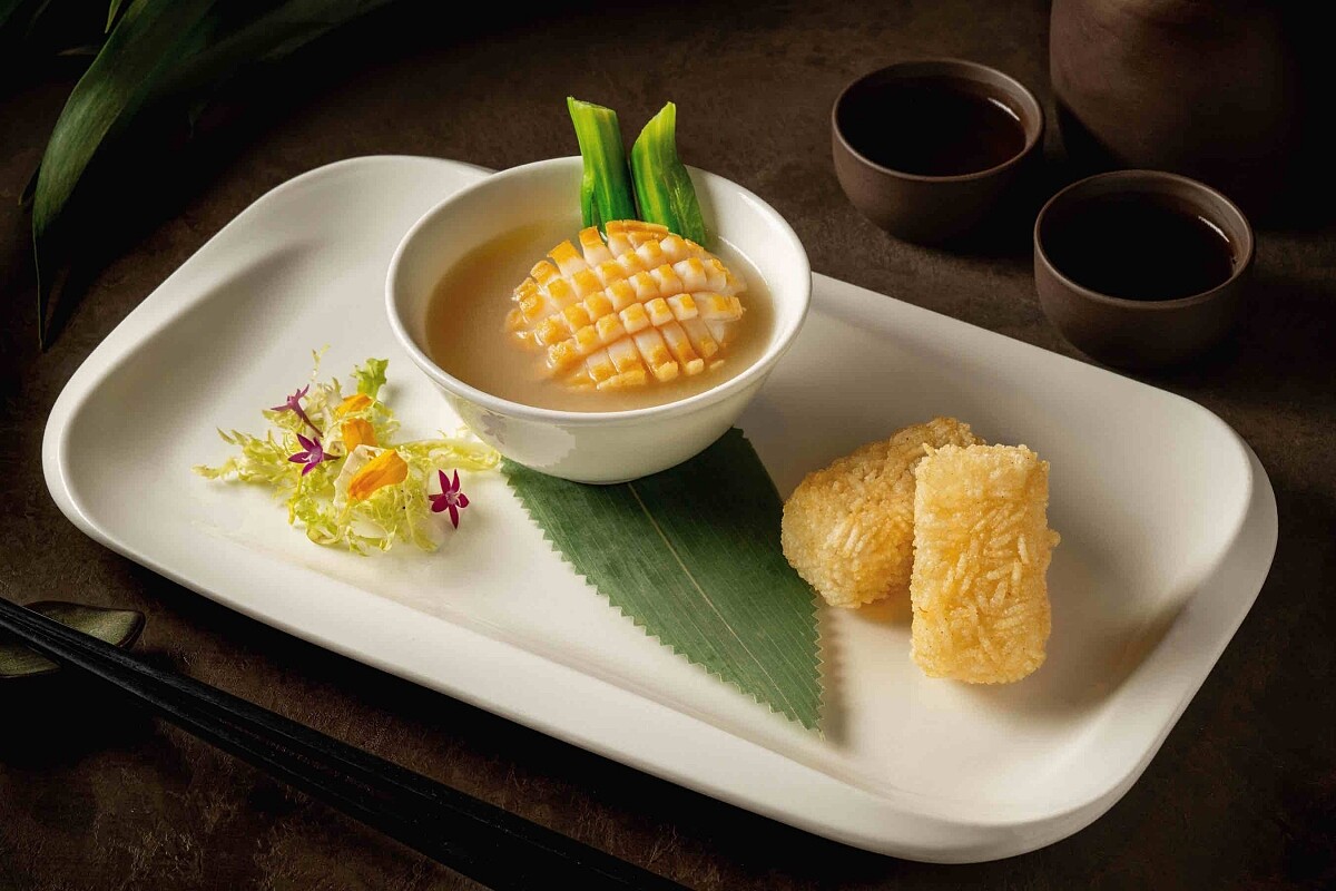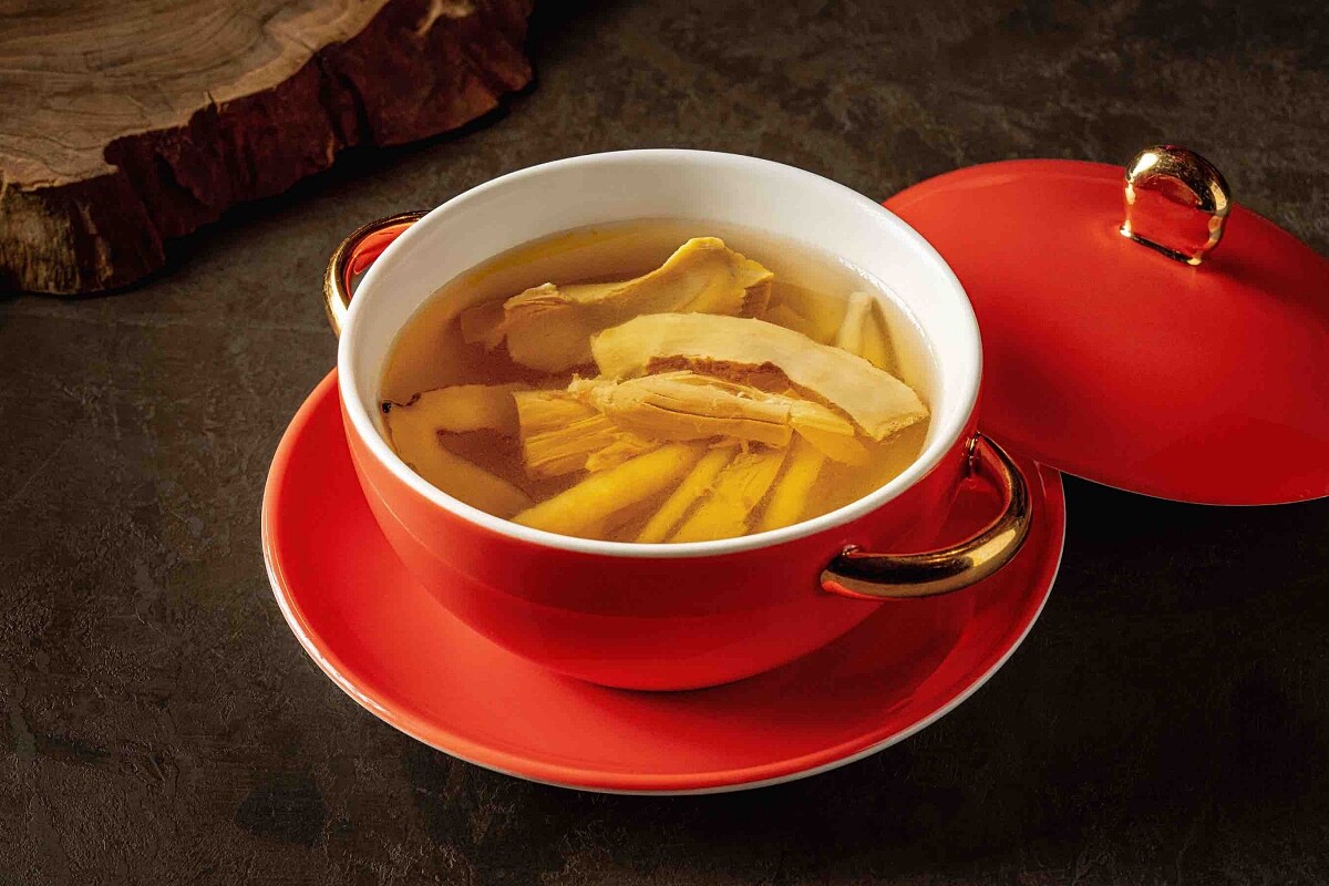 為經典廣式燉湯,其製程相當繁瑣費時,看似簡單的燉雞湯不容小覷,食材煲燉和乾貨泡發的每個準備步驟都能展現粵廚的功力與匠心。濃郁而金澈的上湯是用雞肉、海螺和中藥材沙參和玉竹熬煮入味長達4小時,提煉出最純粹的精華,讓燉湯風味清澈卻濃郁,是滋養元氣的美味料理。主廚更表示,粵菜中「溫度」絕對是美味的必要關鍵之一,尤其湯品更是「一熱遮三醜」,此道湯品展現了合宜燙口的溫度,上桌後香氣迷人,入口又盡是舒心暖意。