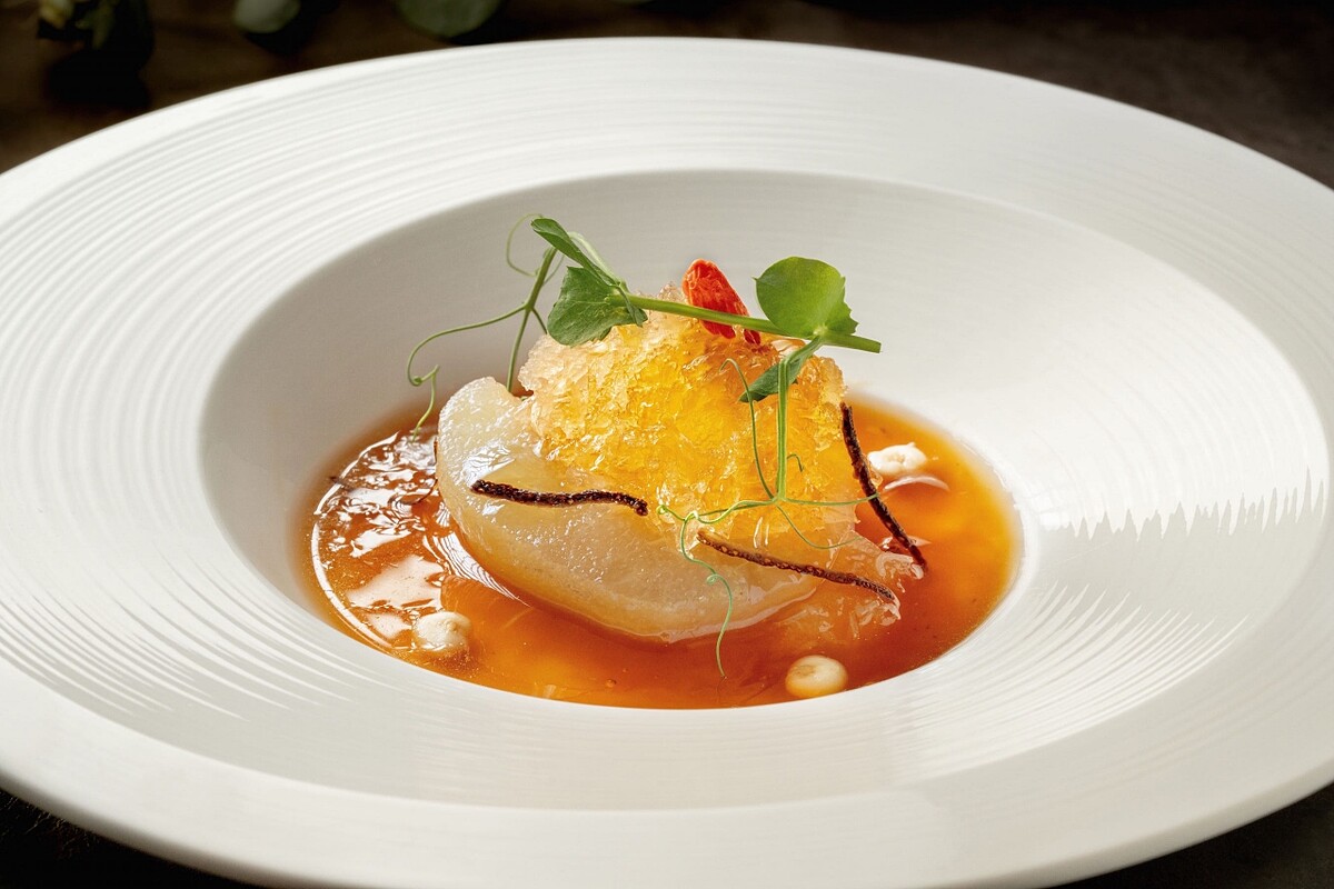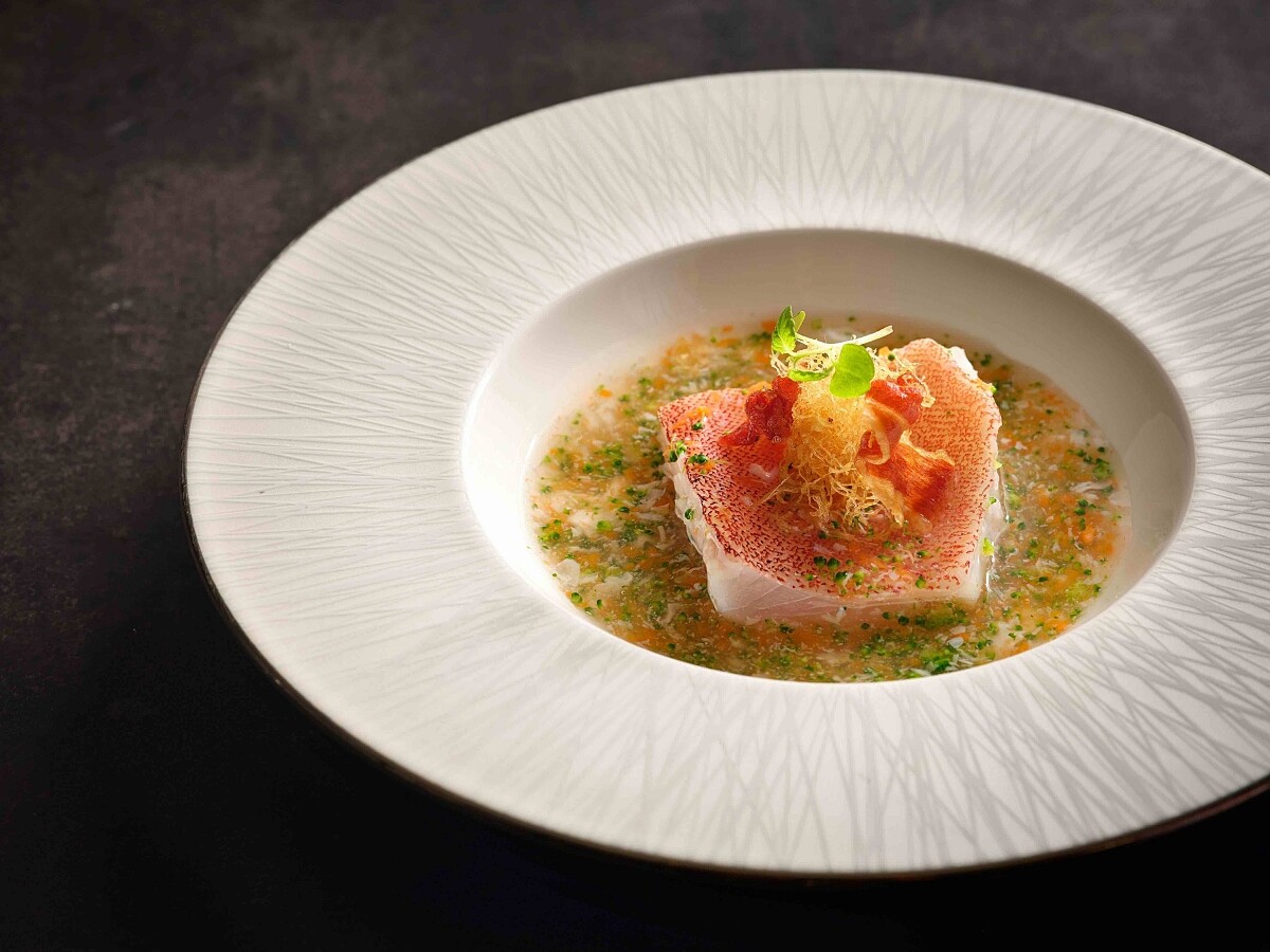 此為主廚創作的拿手招牌菜色,取石斑魚柳精心蒸製,搭配上以精煉的高湯和蛋清製成的醬汁,添加精細切碎的花椰菜和胡蘿蔔碎,增添口感與色澤,並在魚肉上頭綴上酥炸的薑絲和帕馬火腿,讓味道層次更加豐富多樣,呈現獨特風味。