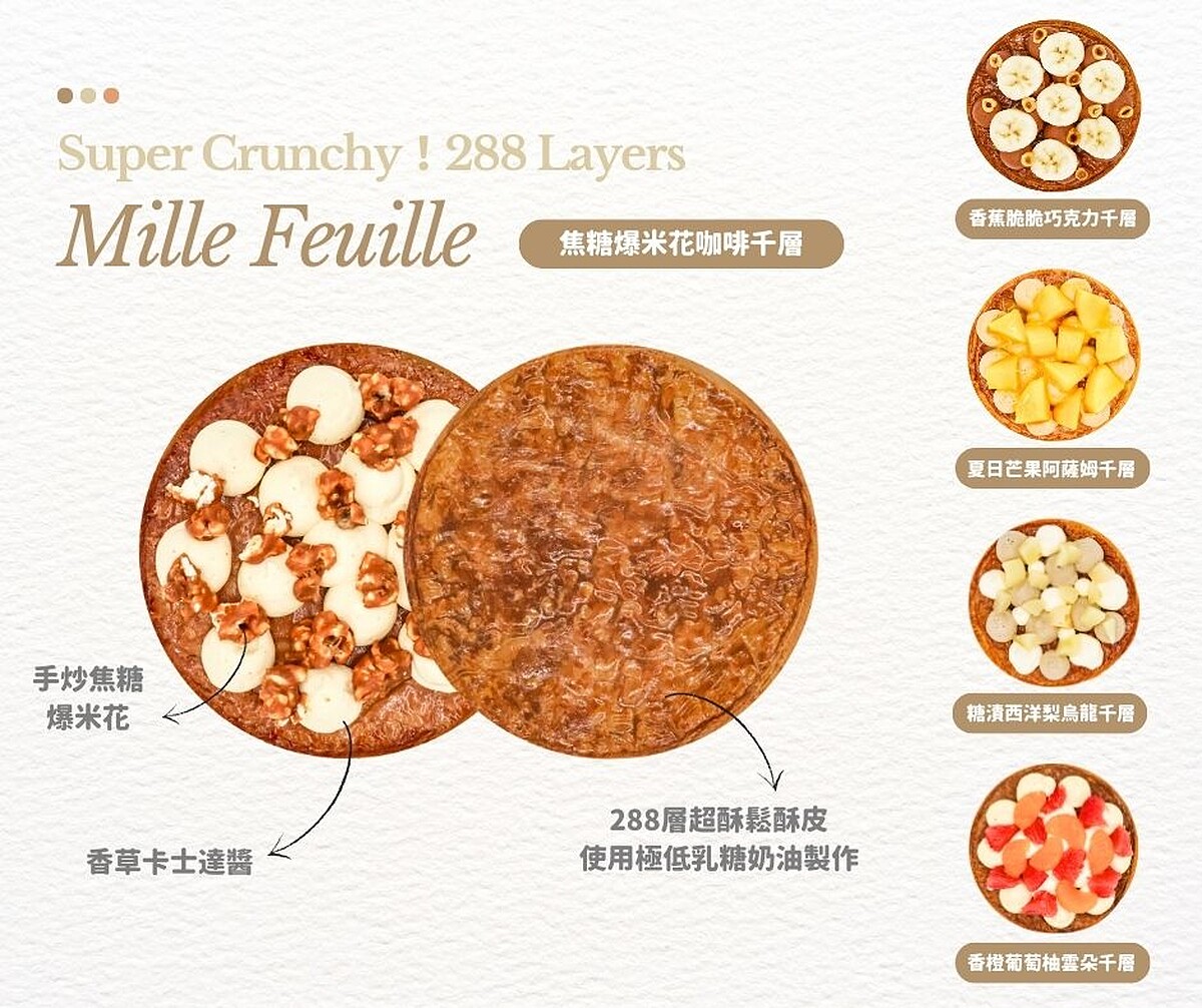 這次為了「勺日新光LetsGo店」,由甜點師親自研發,獨家打造出手拿甜點「288層酥鬆法式千層」,顧名思義千層酥皮上下加起來288層,並採用極低乳糖奶油製作而成,目前公布的口味有「焦糖爆米花咖啡千層」、「香蕉脆脆巧克力千層」、「夏日芒果阿薩姆千層」、「糖漬西洋梨烏龍千層」以及「香橙葡萄柚雲朵千層」,肯定將會是本店「大勢甜點」。