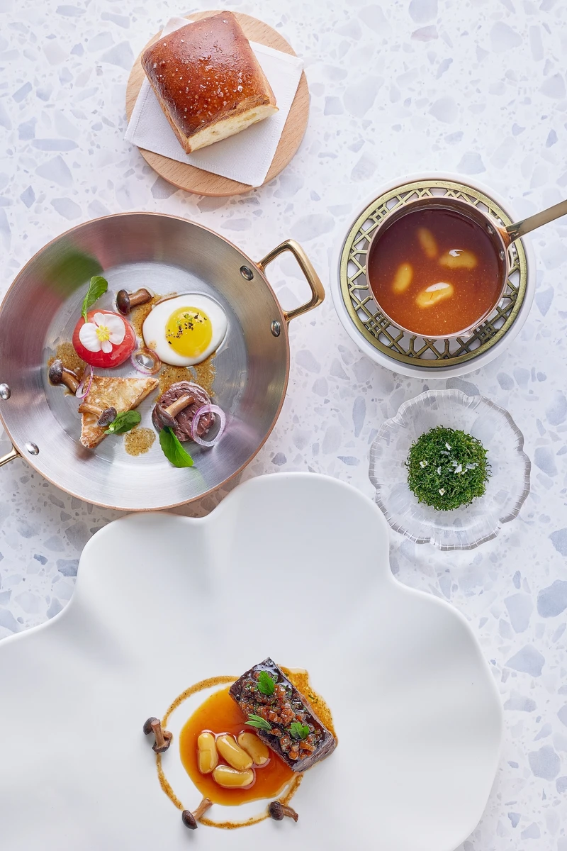 織品藝術詹补(Apu JAN)藝術金工王翔(Sean WANG)皆有英國求學的背景,最令他倆難忘的是英式早餐盤。Chef Alain 為呈現Apu鍾愛的奇幻風格,創作了「會消失的荷包蛋」,使用優格做成的蛋白包覆鵪鶉蛋黃,盛盤上桌就會隨著溫度而融化,視覺效果十足。 隨著主餐上桌的是以煙燻牛油製成的布里歐麵包,刷上楓糖牛油增添香氣,一旁則有酸奶做成的奶油,口感與風味讓人欲罷不能。主菜選用香料牛小排,以牛油的油脂感取代豬肉培根,上頭擺著蘑菇楓糖肉末,增添口感,其餘的英式早餐經典配料也一一呈現,像是番茄、薯餅、薏仁血腸和燉白豆醬汁。