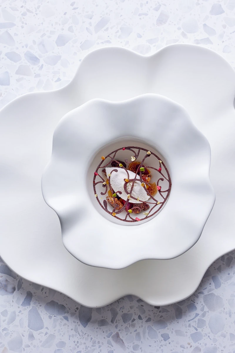 《Cloud Blossom》主餐具一套共有九件組,為主廚與陶藝家家劉子瑜(Christina Liu)聯名燒製,其造型來自雲朵,用此呼應餐廳外大片落地窗的景色,開闊的視野彷彿漫步在雲端之上。「玫瑰紅酒燉雞」為雙主菜之一,以經典的法國菜「紅酒燉雞」為基礎,選用口感鮮嫩的法國春雞製作成肉卷,要以紅酒醃漬入味,搭配上茴香、黑醋栗胡椒醬汁提取鮮味,上桌前再由服務人員撒上以雞皮混合燕麥、乾蔥、檸檬草製成的脆片,一旁還有西芹絲製作的豬肉沙拉,最後淋上玫瑰紅酒醋醬汁,成為一道視覺優雅風味細膩雅緻的菜品。