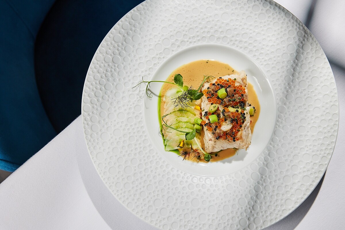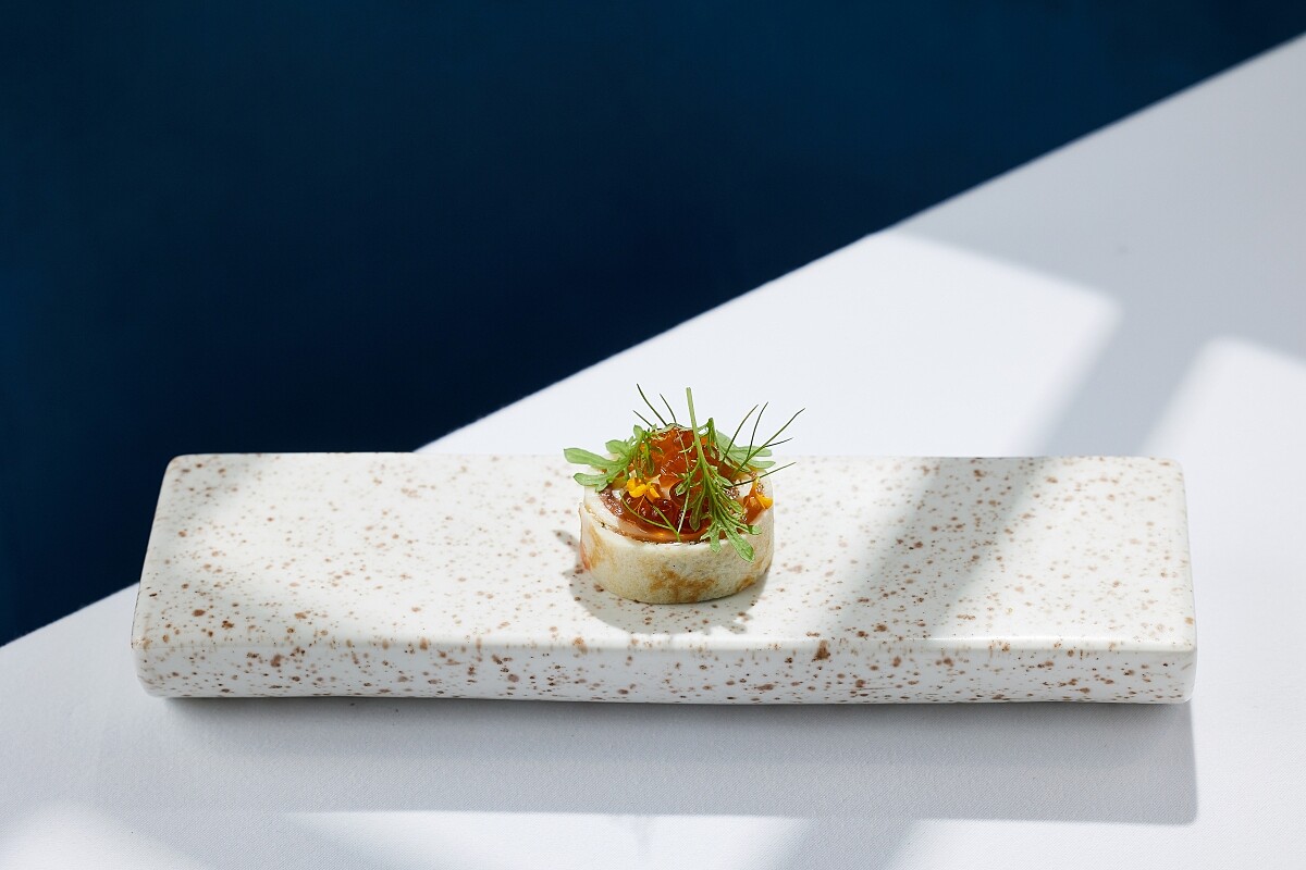 首道開胃小點,是 Chef Lance 向師父 Christian Milone 的恩師 Enrico Crippa(義大利米其林三星餐廳 Piazza Duomo主廚)致敬之作)。Chef Lance 取伏特加調入柳橙、茴香醃漬鮭魚,配合台灣秋季仍悶熱氣候賦予更溫和清爽氣息,再搭配茴香酸奶、可麗餅捲製而成,與鮭魚卵、羽衣綠芥及蒔蘿一齊入口,滋味輕柔、鮮香開胃。