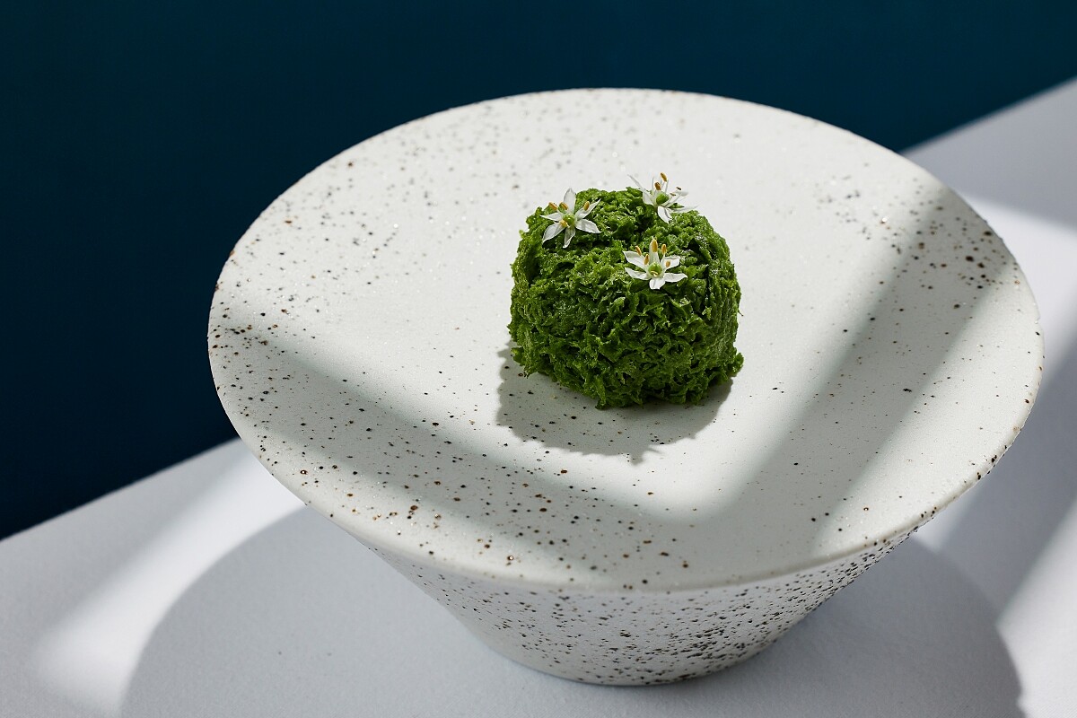 宜蘭三星蔥蔥綠與菠菜汁製作成蛋糕,綴以朵朵白色韭花,細緻蛋糕體包覆軟質Fontina Cheese內餡,口感綿密柔滑,奶香溫和清新。