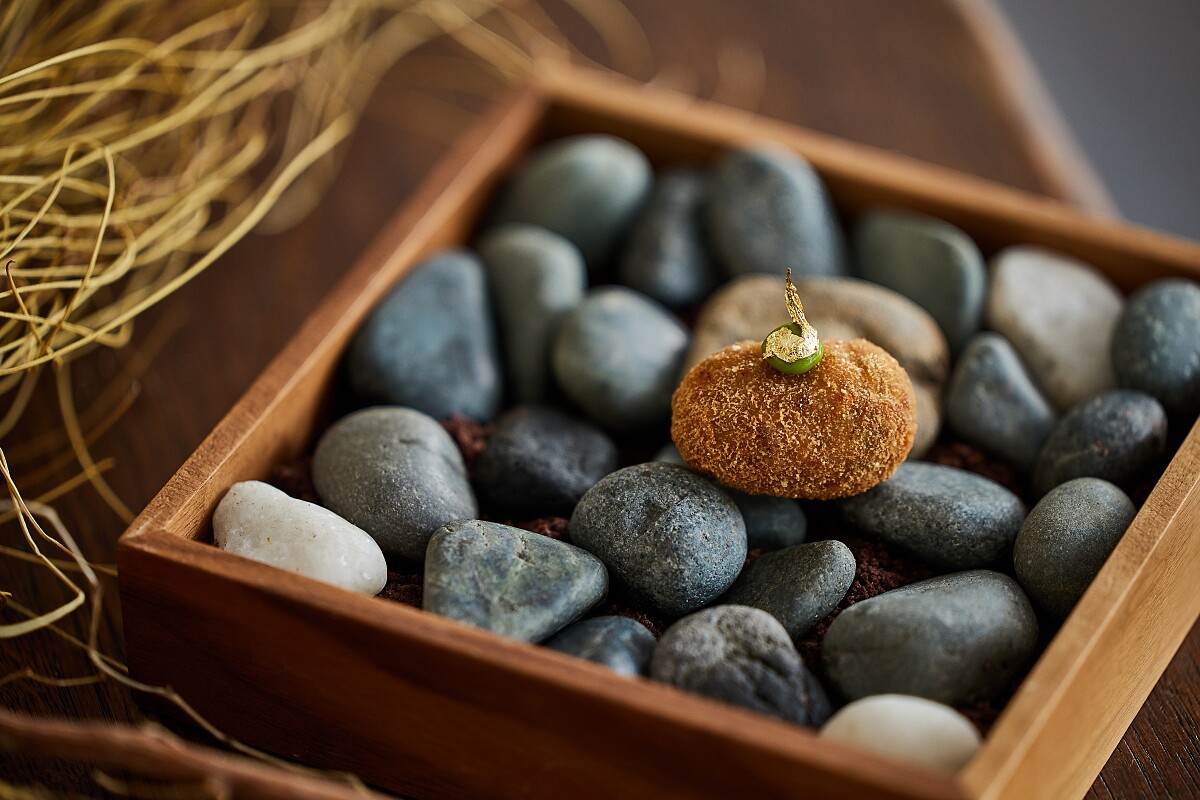 源自義大利 Marche 區的炸橄欖鑲肉,是義大利酒吧傳統佐酒小點,也是Chef Lance在義大利研習時與師父小酌必點下酒菜,取豬絞肉以孜然、黑胡椒調味後混合洋蔥,填入去核綠橄欖裹粉酥炸,佐酸豆美乃滋享用,酥香濃郁、鹹酸誘人。