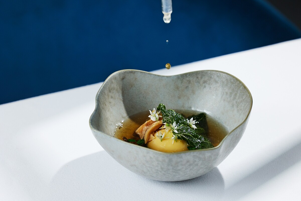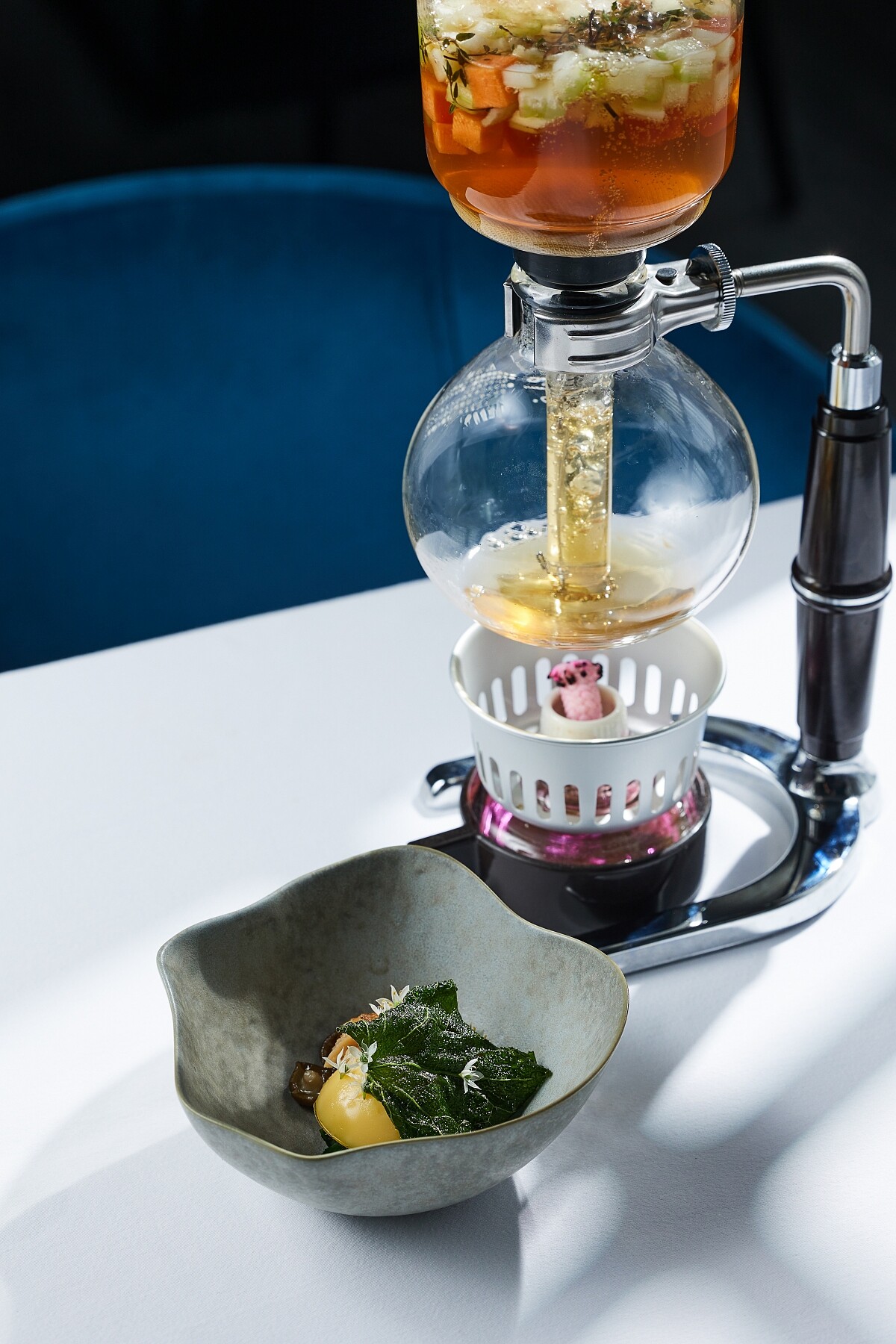 Stracciatella 義式蛋花湯為羅馬傳統家常菜,也是每位義大利媽媽都會烹煮的溫暖滋味。本季Chef Lance賦予此道經典義式湯品更多儀式感。虹吸壺將金黃色的澄清雞湯萃取至上壺浸潤新鮮紅蘿蔔、芹菜、洋蔥、百里香,讓蔬菜香草釋放芬芳,再於桌邊將熱湯徐徐注入裝盛蒸蛋、菠菜碎、菇蕈的湯碗中,最後滴入干邑白蘭地增添醇香尾韻,滑嫩蒸蛋佐清澈甘美雞湯,優雅溫潤,粉紅螃蟹菇特有的甲殼鮮香為湯品巧增海味與秋意。