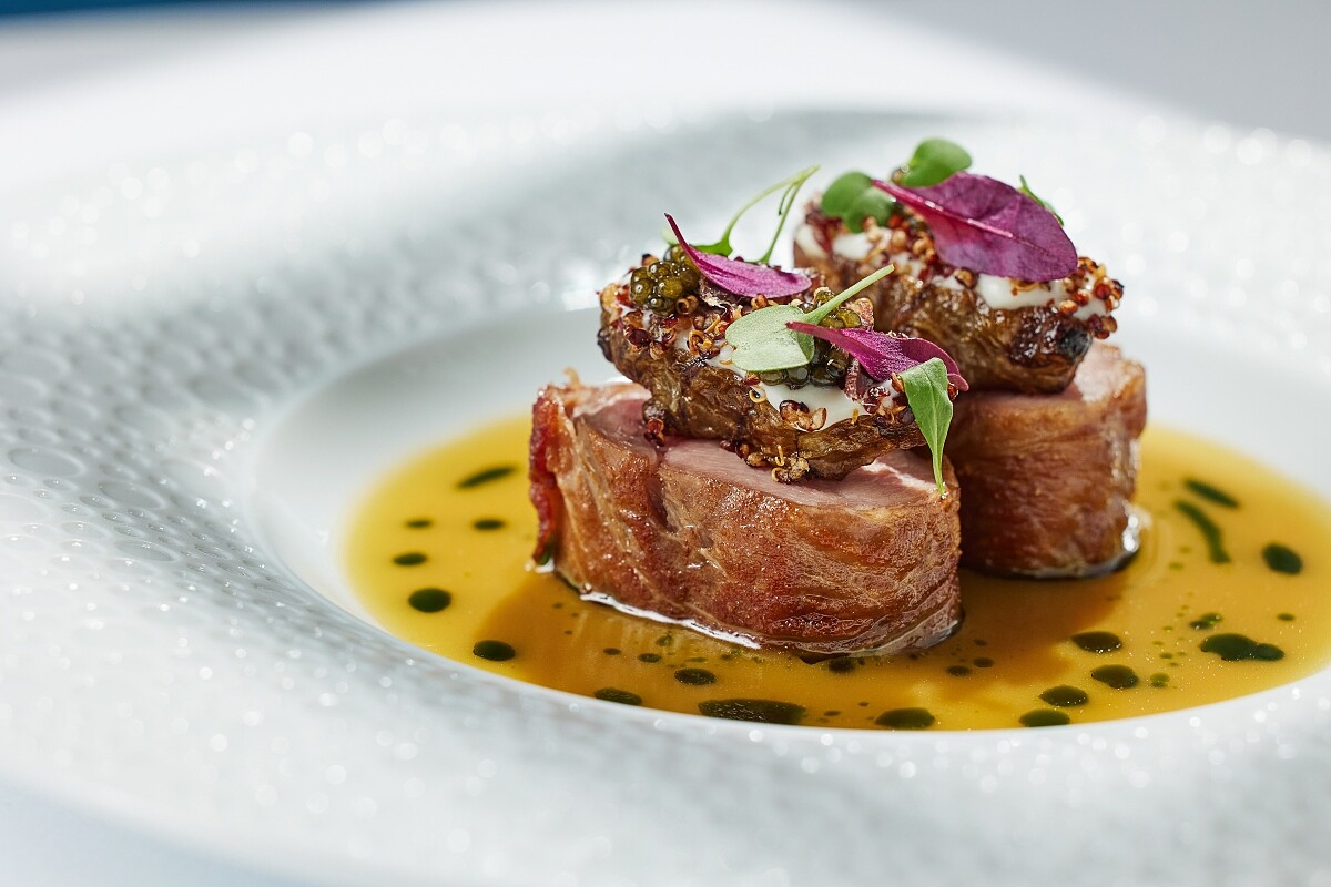 義式小牛肉卷 Saltimbocca 字義為「跳進嘴裡」,生動展現此道羅馬馳名老菜的美味程度。取舒肥至七分熟的紐西蘭小牛肉拍扁後佐鼠尾草、迷迭香,以義式生火腿包捲後香煎,外皮略顯焦脆、內裡肉質柔嫩,沾佐雞高湯融合奶油、鼠尾草熬煮之濃醬為食慾之秋增添醇厚,滴入翠綠巴西里油增添香草清新,與油封朝鮮薊、酸奶、法國奧賽嘉Oscietra魚子醬、紅藜麥於唇齒間併發多重層次口感,亦平衡肉捲豐美油脂。