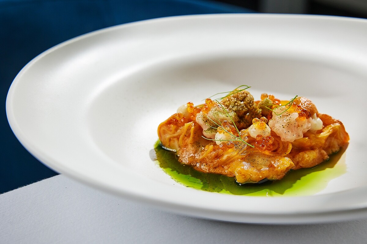 Lasagna肉醬千層麵為歷史最悠久的義大利麵料理,也是餐桌上最無法抗拒的療癒美味。Chef Lance大膽顛覆肉醬搭配千層麵的傳統,結合寶島秋日正肥美的透抽、鮮蝦、干貝等海鮮,與蛤蜊白醬融合茄汁製成之粉紅醬、莫札瑞拉起司、帕達諾起司層層堆疊焗烤而成,佐馬糞海膽、鱒魚卵、干貝美乃滋與蒔蘿油一起享用,生熟海鮮不同層次的鮮甜與口感於唇齒間躍動,為經典義大利千層麵增添島國風情,享有澱粉的滿足卻不造成負擔。