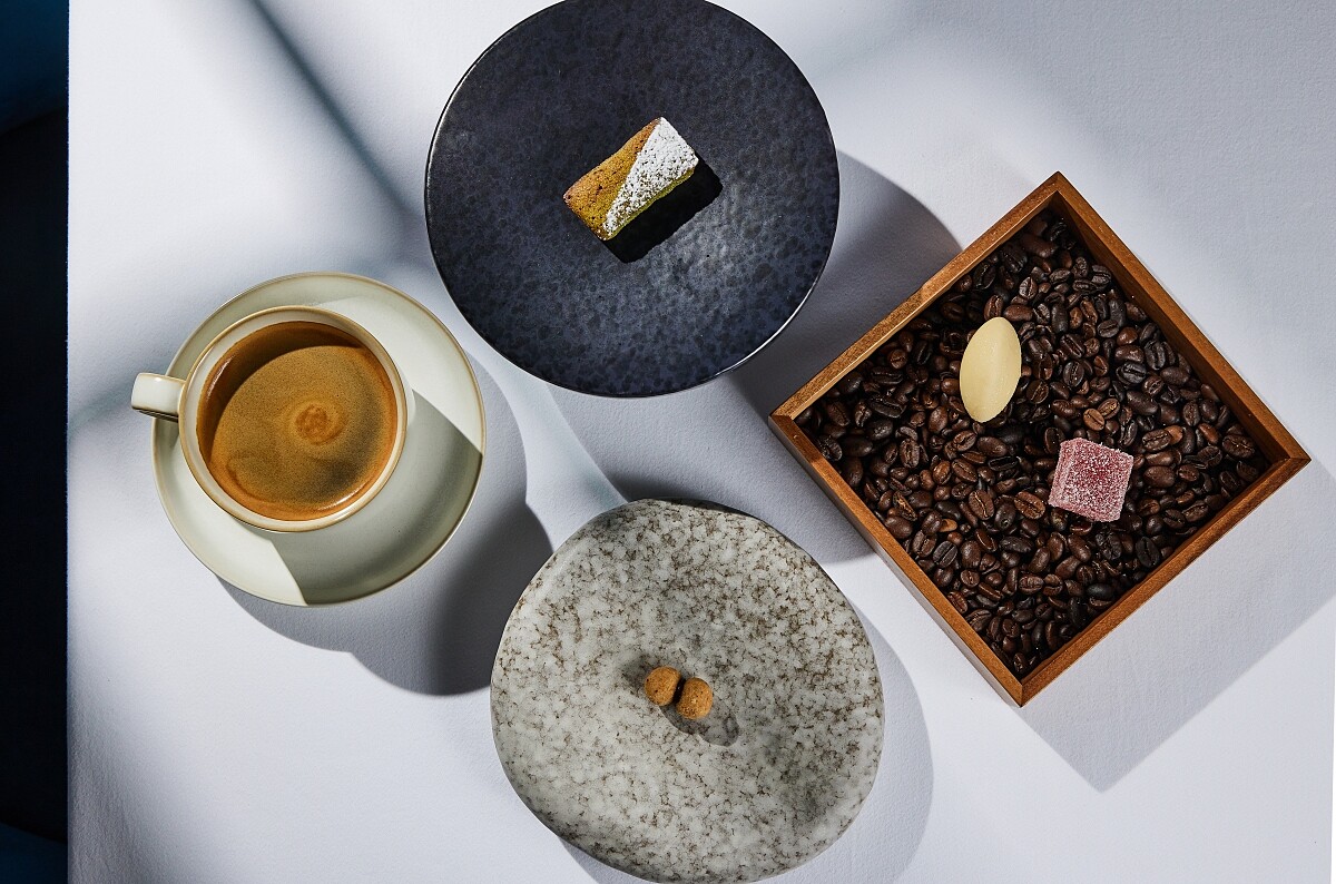 「百香果白巧克力」香甜白巧克力脆殼內蘊藏酸香百香果流心,驚喜爆漿、酸感滿點。 「榛果酥餅」北義皮埃蒙特地區傳統甜點Baci di Dama(譯為淑女之吻),由兩個半球型榛果酥餅與榛果巧克力醬組成,宛如浪漫的親吻,酥化口感漫佈濃郁堅果暖香。 「白桃軟糖」Q軟細緻口感,散發奔放濃郁白桃果香。 「抹茶費南雪」質地濕潤而紮實,帶有抹茶清香與焦化奶油特有濃香。