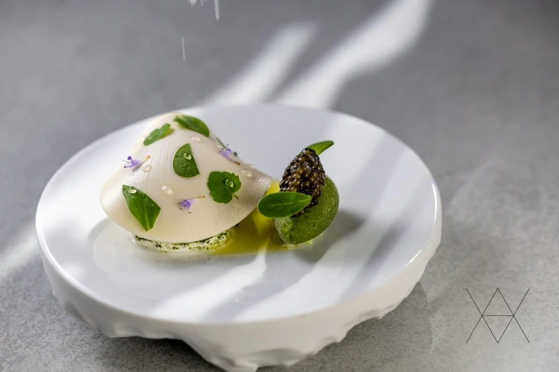 展開序幕,選用飽滿的生蠔為主食材,在使用生蠔本身的汁液烹煮後,底部搭配由橄欖油、日本米醋調製的小黃瓜切丁,為其點綴出層次豐富的風味與口感;生蠔上方和酪奶薄片之間,更散發著酪乳和西班牙微藻粉的香氣,帶來濃郁的海洋餘韻。另一道充滿亮點的菜色則是由台灣香檬、芥末菜和小黃瓜精心製作的雪酪,再搭配珍貴的晶鑽魚子醬,營造出極致的口感和味覺享受。最後,液態氮製成的酸奶和辣根粉末輕輕灑在頂部,為整道菜品增添了沁涼的口感,完美地融入生蠔的鮮甜滋味。