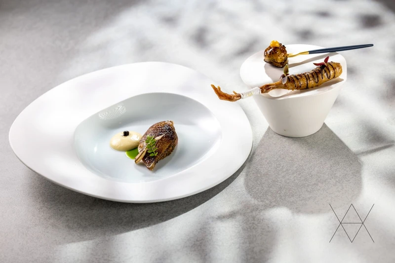 主菜將賓客引領到充滿秋季狩獵氛圍的餐點中,選用來自桃園在地農場的優質鵪鶉,並在滑嫩胸肉中填入由新鮮白蘑菇、發酵牛肝菌菇和奶油精心製成的內餡,再經由碳烤烹調賦予獨特的香氣風味。淋上由美濃綠胡椒、醋和糖的醃漬後切碎並炒香,再加上法國藥草酒和燈籠椒製成的醬汁,口感微辣成熟。而點綴於一旁的煙燻馬鈴薯泥和黑蒜泥則帶有秋季濃郁的煙燻香氣,搭配特別醃漬過的蕗蕎和蕗蕎油,為味蕾帶來無限驚喜。此外,細心烹調的雞腿肉先經蒸煮再烤製,刷上杏桃果膠並淋上黑蒜泥,搭配以台灣土雞肉、雞軟骨、雞胗以及炒洋蔥所製作的肉丸,更為整道菜品增添了豐富的野味元素,濃厚而精緻的奔放口感,秋季狩獵的畫面油然而生,享用同時也彷彿親臨秋日狩獵現場。