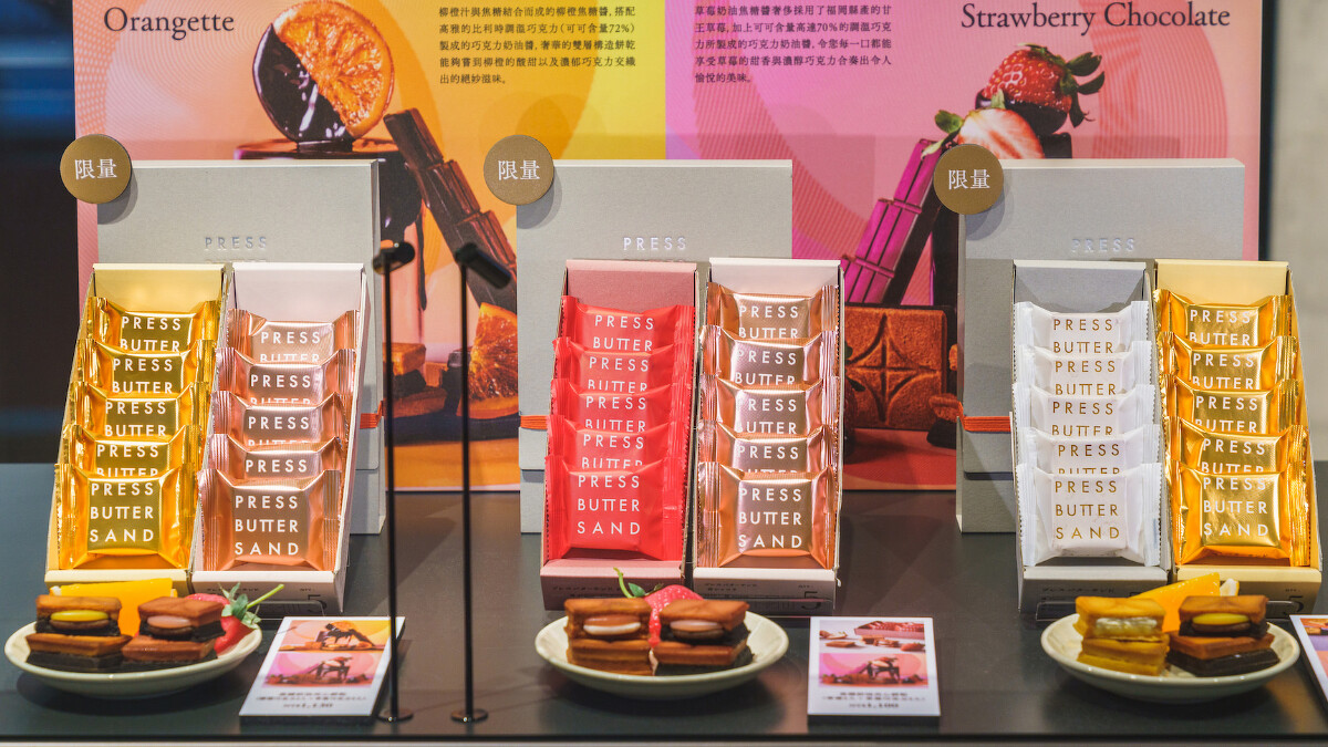 PRESS BUTTER SAND於10月7日在新光三越Diamond Towers正式開幕,為了原味呈現現烤BUTTER SAND,餅乾材料與特製烤台全從日本原裝進口。除此之外,在日本一上架即秒殺的季節限定口味「草莓巧克力」、「柳橙巧克力」焦糖奶油夾心餅乾在台北也吃得到了。