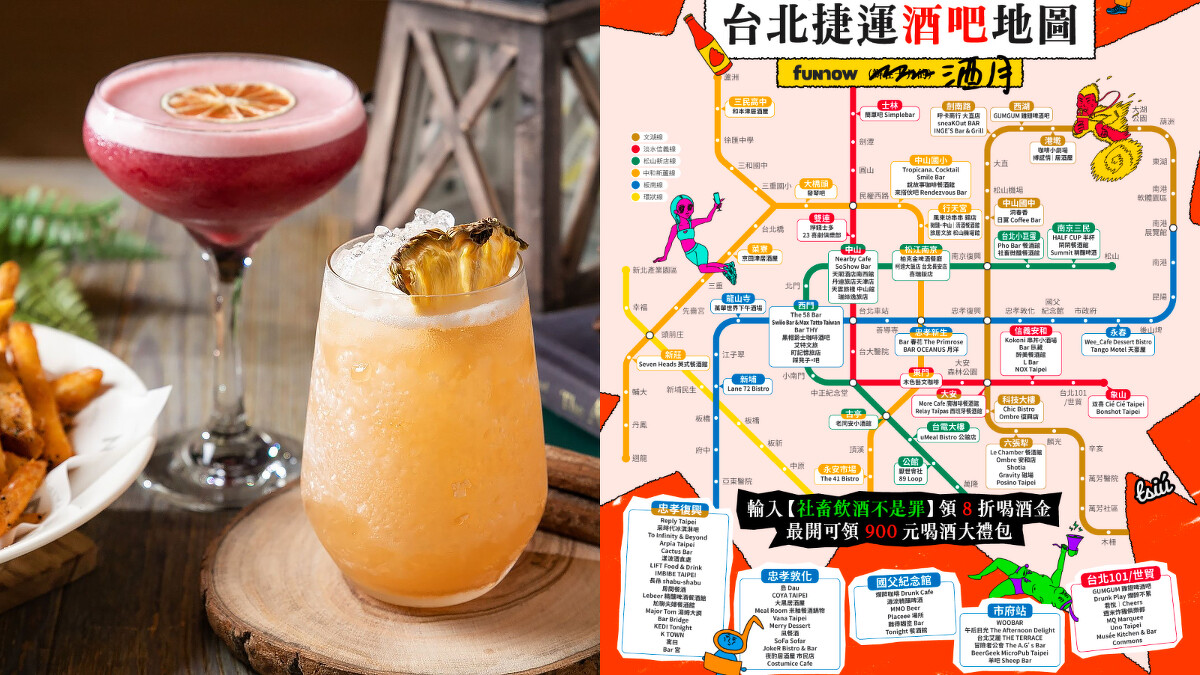 預訂平台 FunNow網羅台北捷運沿線最讚酒吧,推出超級實用的「捷運酒吧地圖」,喜歡小酌的你絕對不能錯過。