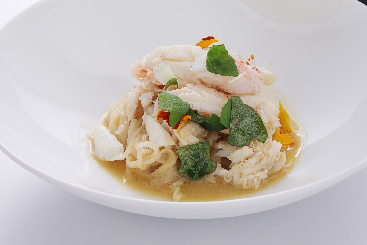 為大班樓重量級的招牌菜,在此次餐會做了細微的調整,這道料理的特色是將所有元素拆解再重新建構。先取用花蟹並以花雕酒、蜆原汁清蒸,接著精煉蟹汁濃縮、花雕陳釀做成醬澆淋於上方,而原版的陳村粉(為廣東地區常見的主食,是一種米製粉類)則以鮮美的花枝細絲取代,最後將所有食材拌勻後食用,蟹肉仍然吃得到清甜的滋味,然而醬汁使得味道更為飽滿,唇齒間盡是酒香蟹甜的餘味,花枝細絲不但滑順且因為醬汁的襯托更顯其味鮮,也才明白此道料理何以成為饕客口耳相傳的人氣料理。