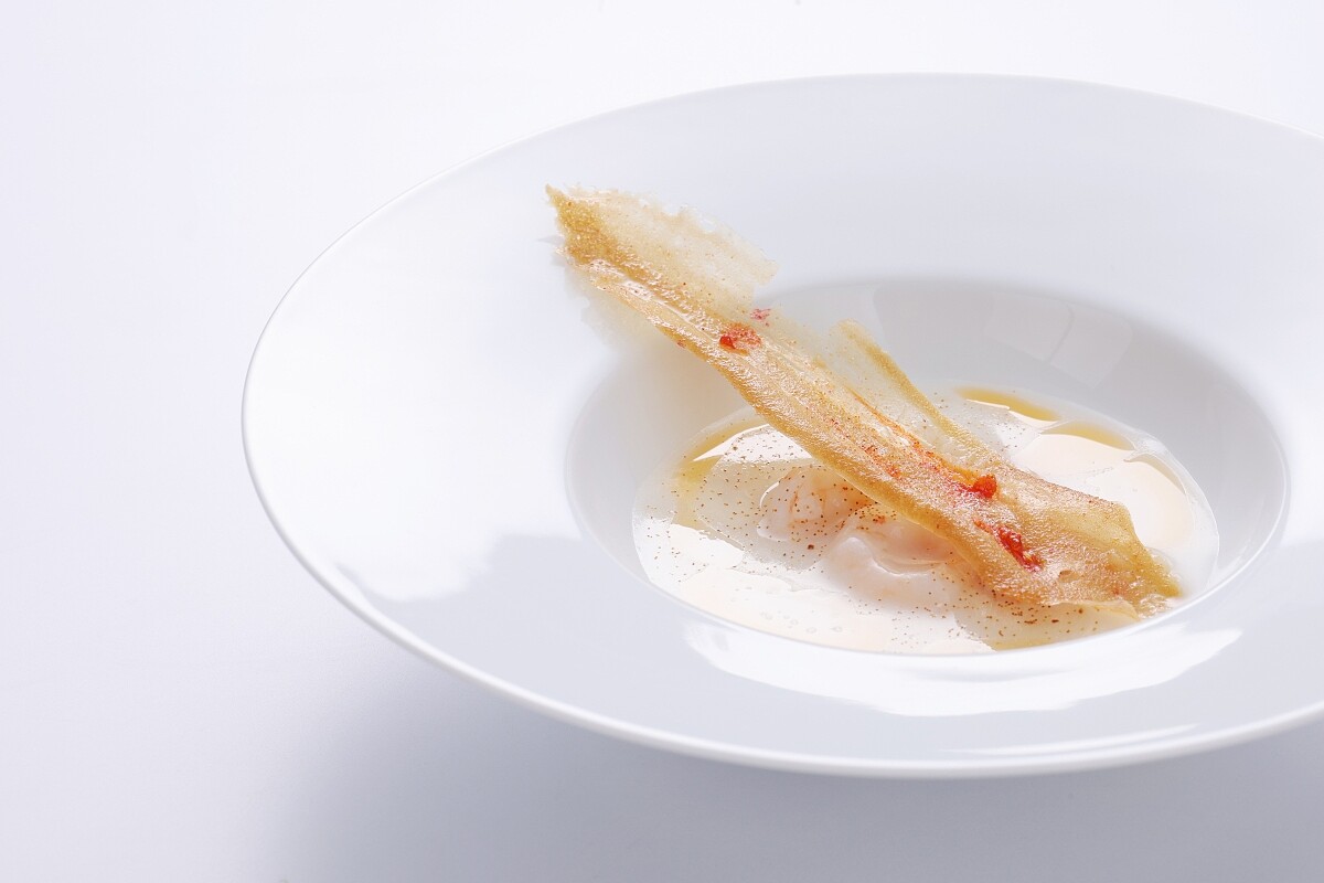 第二道也是大班樓知名的「魚米粥」,主體濃稠的粥液是以泰國香米、日本圓米加上蝦汁熬製,而野生小劍蝦則浸泡其中,最後點入蝦油提香,也串連起所有食材的香氣;擺放其上的同樣是以蝦子做成的薄片,抹上蝦膏、綴上味道鮮美的蝦籽,細膩的法式堆疊完美的展現在這道菜品中。