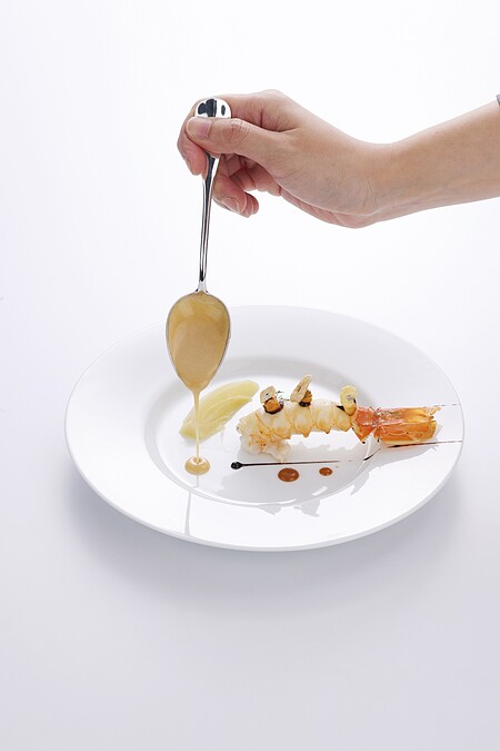 取用百顆南非鮑熬湯,再將鮑魚打碎融入其中,最後細火慢熬濃縮其風味,蓋上的是法式料理常見的千層酥皮,再以法式酸奶、魚子醬、接骨木花堆疊於上方,優雅的呈現強烈的海味湯品。
