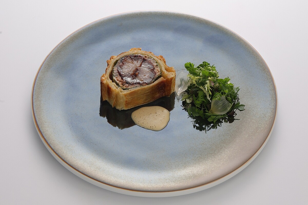大班樓的叉燒在「亞洲第一中菜」加持下有了全新定義,恰到的火侯燒得油亮豐腴的滋味,是饕客夢寐以求的美味。此次葉一南為求原汁原味在台呈現,往返來台尋找合適的豬肉,在幾番聯繫下有了實現的可能,然而,大班樓只取用粵語中「第一刀」部位,那是宰殺豬隻下刀的位置,就在頸椎部位,且一頭豬僅有一塊十分珍貴,不但肉質滑嫩且無筋,最適合用來做叉燒,由於台灣無此使用習慣,葉一南特地拍攝影片教授切法,好獲取其部位。此次餐會,陳嵐舒主廚以威靈頓牛排為概念,將叉燒以雞肝、肌肉與蘑菇製作成慕斯包裹,最後覆上橄欖葉,最外層則是經典的酥皮質地,搭配上叉燒醬汁做成的奶醬與生菜,將粵式叉燒做了精彩的轉換。