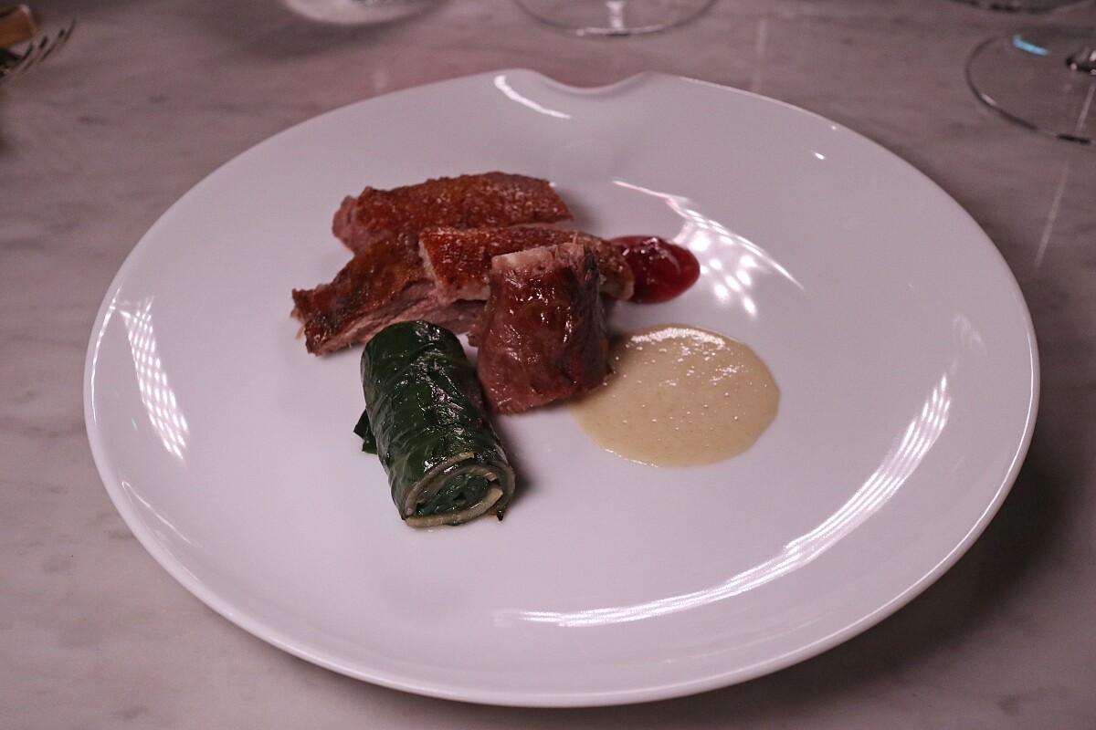 以鵝油浸置全鵝兩天,再以低溫熬煮8小時,接著風乾,再以樟木燻製,最後用熱油澆淋外皮使之酥脆,其工序相當複雜,得整整耗時三天才能完成。搭配上藜麥威士忌醬汁,以及鵝肝製作而成的泡泡,陳嵐舒主廚特地以台灣川七、咸豐草以及花生葉裹成的菜卷,絲滑的口感,跟鵝肉的質地做了口感上的對比,佐上法料上經典的李子、紅酒醬汁搭配,一旁則特地附上脖子部位,能享受到另一種日常中啃食的口感。