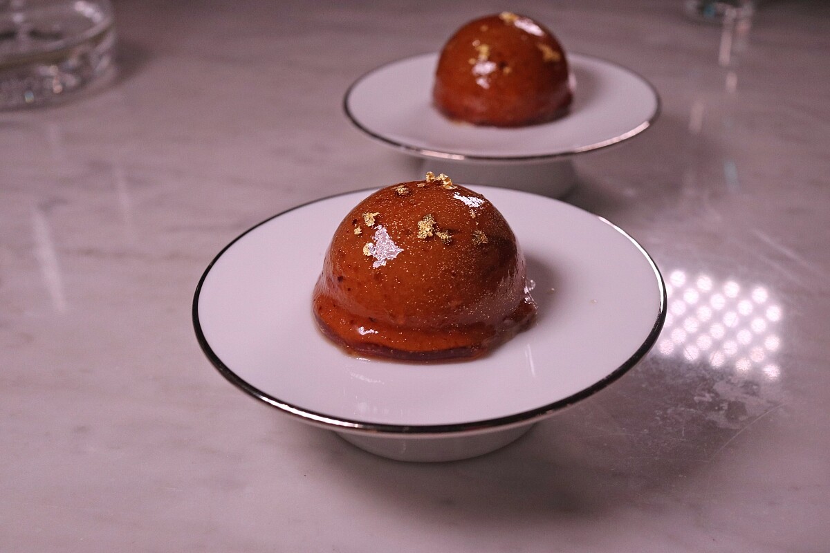 陳皮為粵菜調味特色食材之一,其品質與等級隨著年份而提升,陳香醇厚能為菜色風味增添風味。此道清口甜點就以大班樓的紅豆湯為概念發想,紅豆與矜貴的三十年份陳皮一同熬煮成內餡並冰凍成雪糕,其外層則以黑糖、陳皮風味做成果膠鏡面,點綴上金箔,是道口感細緻、風味優雅的中式甜品。