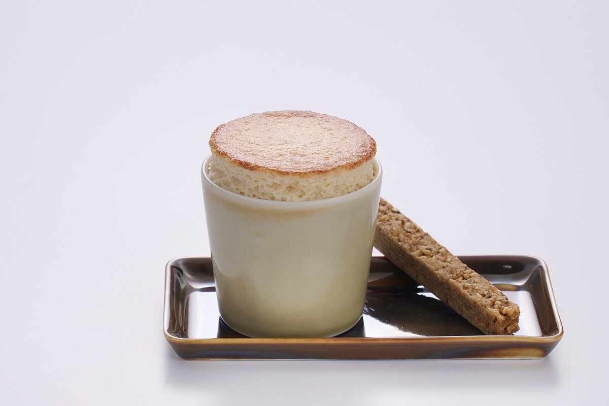 將杏仁茶轉換為經典的法式甜點舒芙蕾,選用杏仁利口酒製作,將港式經典的飲品以另一種形式展現甜美獨特的風味。一旁則有芝麻桂花杏仁酥的餅乾,酥脆的口感平衡了舒芙蕾較為甜膩的滋味。