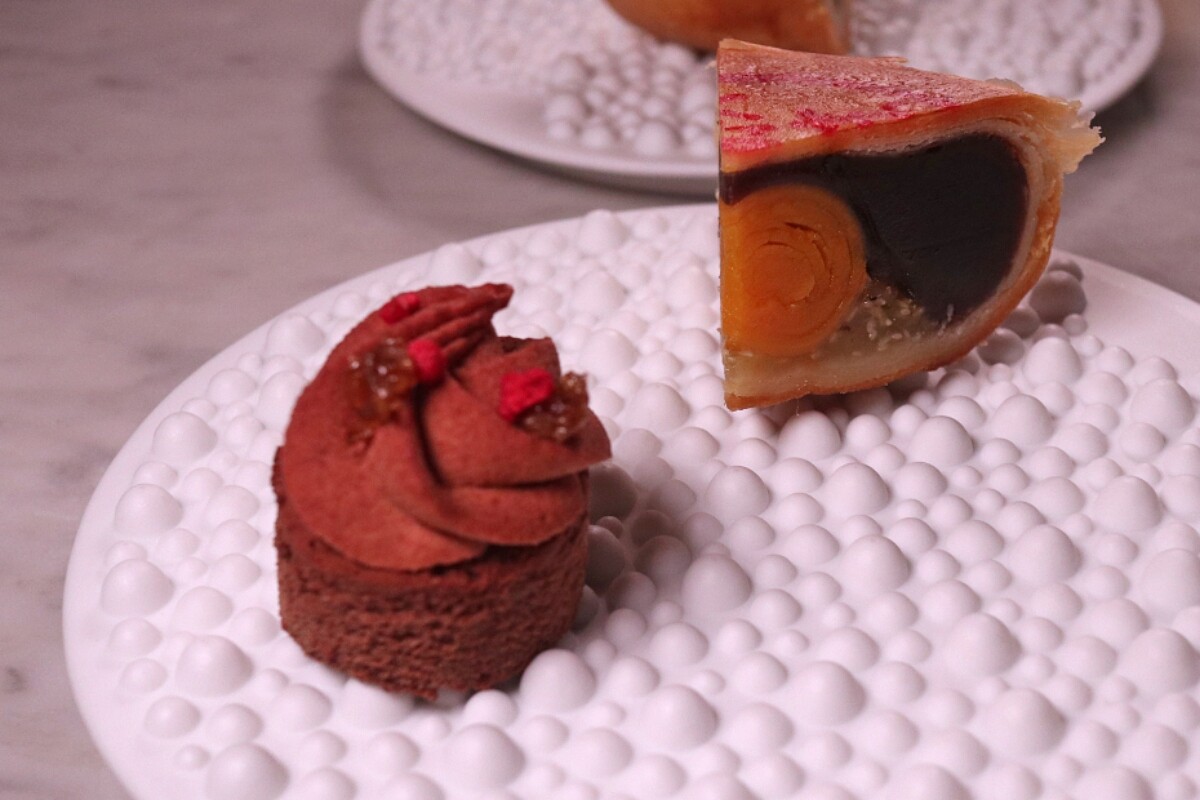 茶點為紅豆餡與冬瓜餡製作而成的月餅,中間則有帶著紅燦油光的鹹蛋黃,是款十分傳統的糕點,另一邊是十分西式的巧克力慕斯蛋糕,灑上香氣十足的玫瑰糖,為餐宴做了最完美的一道收尾甜品。