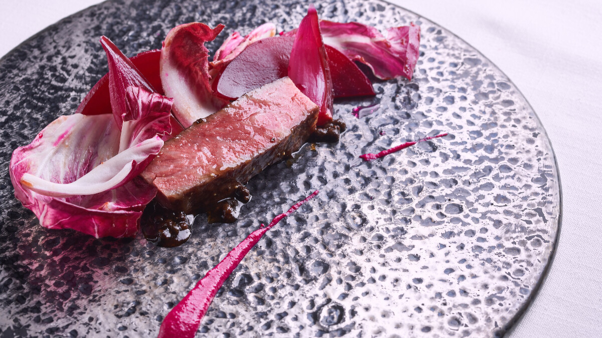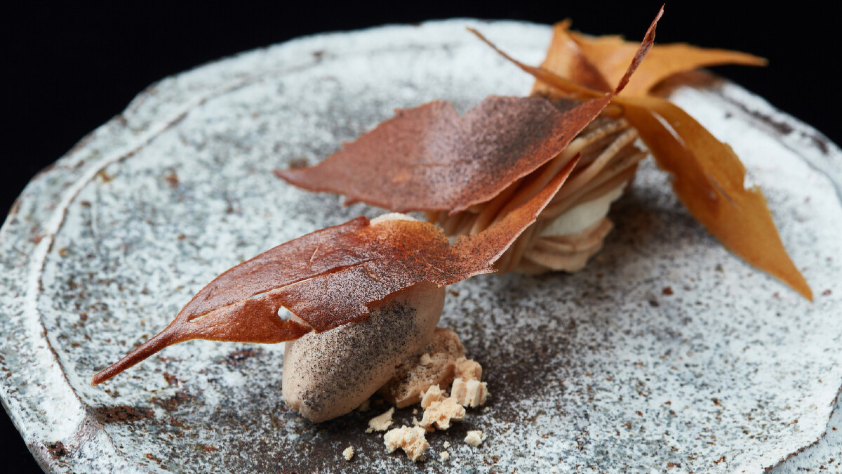 「炙燒藍龍蝦、法國藍腳菇、日本峨螺、牛蒡」將法國新鮮藍龍蝦以直火炭烤,佐藤秀明憑藉熟練的火候掌控呈現外殼微焦、肉質維持滑嫩貌,卻又保有煙燻風味,佐搭的法國藍腳菇彈牙口感、鮮甜的峨螺與牛蒡則賦予這道菜色更豐富的滋味。「日本和牛、朴葉、有馬山椒」選用肉質軟嫩、紋理細膩的和牛與日本朴葉一同烤製,和牛本身與朴葉所散發出的燻香完美合拍,再以山椒汁調味,濃郁香氣噴發令人難以抗拒。