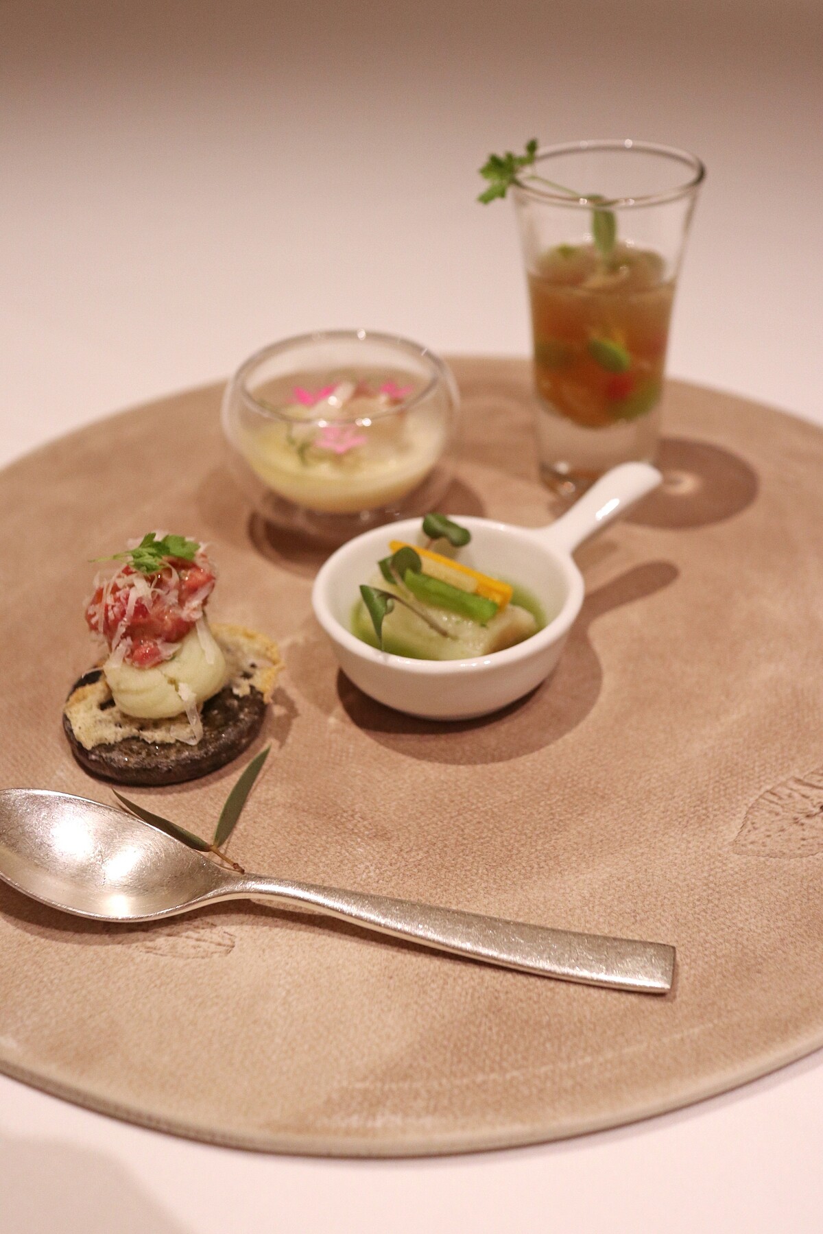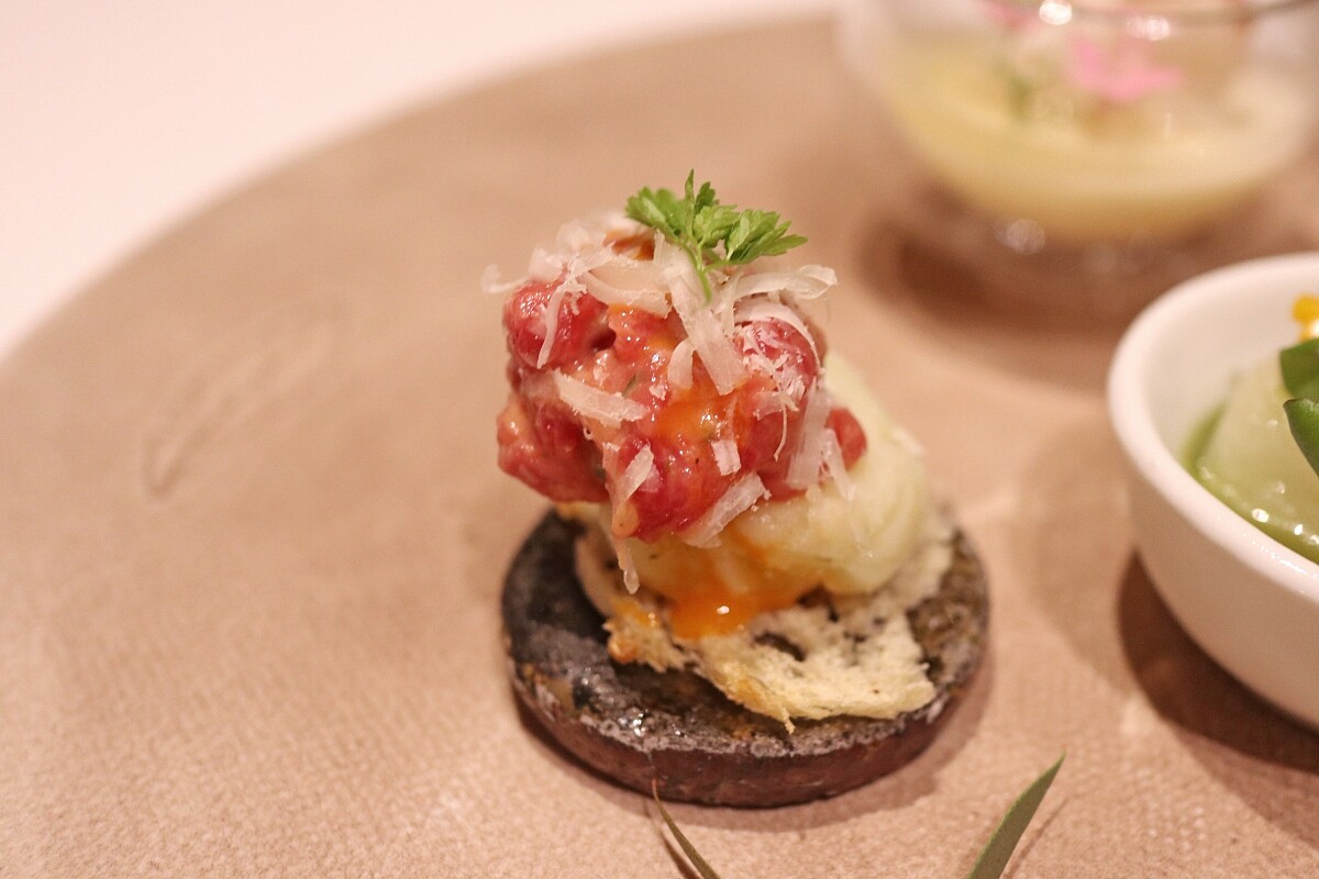 這是最能代表「巴黎廳1930X高山英紀」的主廚迎賓小點,食材風味交織出飽滿的秋季風情。 「番茄澄清湯」以梨山烏龍茶為湯底,濃郁的番茄,馬鞭草融入其中,清香風味是引饕客進入鮮味飽滿的序曲。去皮炸過再吸附蛤蠣與菠菜泥湯汁的「台灣茄」,上層疊以日本栗子南瓜,增添溫潤甜味,並搭配上薑絲、高麗菜苗。接續的「章魚牛奶」柔化以普洱茶舒肥,延續秋日暖意。最後取牛菲力製成的「生牛肉塔塔」,層疊於極薄的麵包片之上,層疊著各種香料的氣味,帕瑪森起司帶來的奶香呈現和諧奔放。