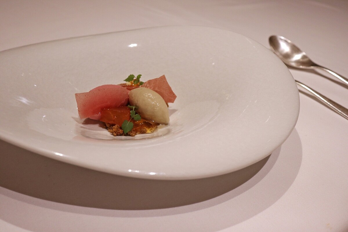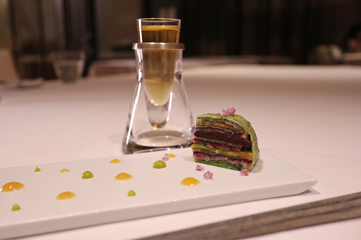 這是高山主廚的代表作品,每季都會將其中的食材替換,作些微的調整,這次用到柿子、酪梨、甜菜根,加入代表日式元素的醋飯,其酸香成為貫穿食材的重要調味,主廚使用蜜香果茶跟蘋果醋,果香味濃郁富有層次,包裹在最外層的則為鮮甜的高麗菜葉,點綴上紫蘇花、酪梨壽司醋醬汁、橙色的蘋果醋醬汁,將千層壽司從右至左劃去沾附醬汁後即可與一旁的桂花烏龍茶一起享用。