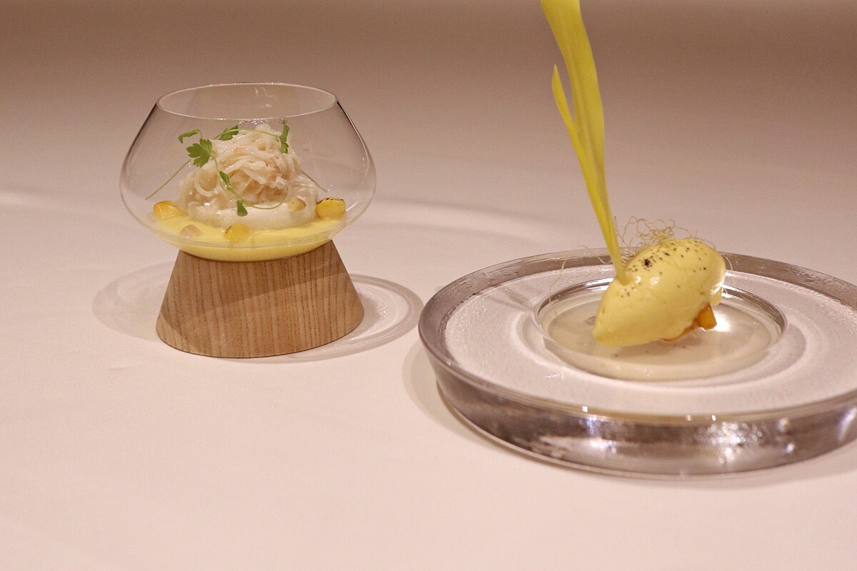 為追求秋蟹極致展現的饕客所設計的菜品,以新鮮玉米泥調和為底,中間夾層蛋白酥皮,接續則為以醋、薑、蘋果醋調味後的帝王蟹絲,整道食來兼顧酸甜滋味、柔軟與酥脆口感兼具。搭配著玉米冰淇淋交錯享用,趣味橫生,底層薄荷凝凍為冰淇淋帶來清爽,上方點綴水仙炭培茶粉,香氣清揚優雅。此道料理設計於中秋前後,高山主廚特地來台感受台灣傳統節慶,因此餐廳特別設計視覺體驗,透過火光閃爍、煙火味呈現。