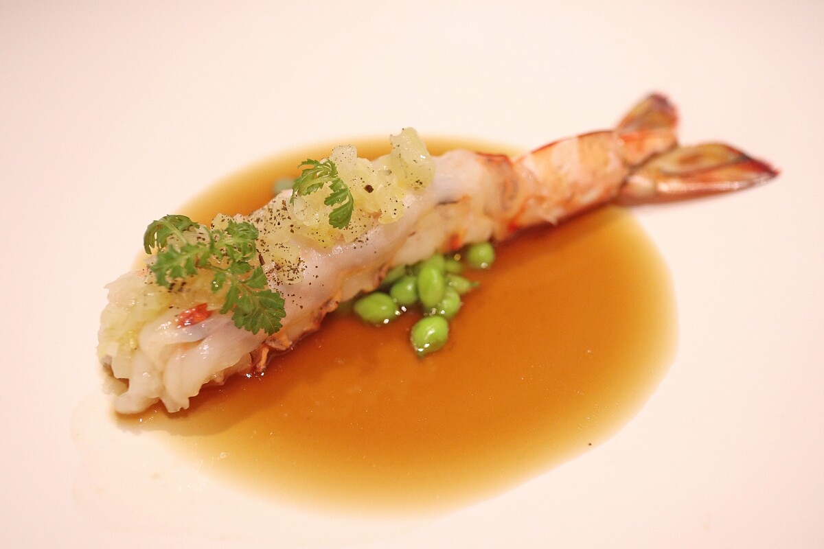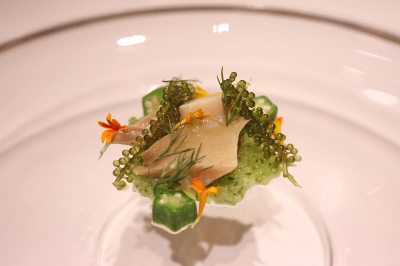 以日式料理方式完成,為呈現鮮嫩多汁的口感因此將鮑魚蒸煮長達12個小時,搭配上海葡萄跟秋葵,透過海葡萄獨特口感帶來多種層次,以及強烈的清新香氣,醬汁則使用小黃瓜、洋蔥、青椒打成泥狀,其強烈的氣味襯托出鮑魚的鮮甜滋味。