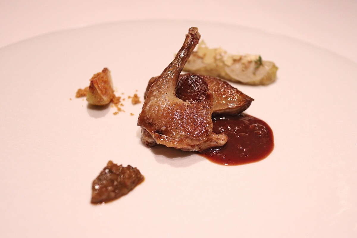 主菜屏東乳鴿展現秋日野味之豐,將乳鴿洗淨後,冷藏風乾一天,取鴿胸肉以直火碳烤、腿肉則裹上輕薄粉衣油炸,以炭烤後油炸表現胸皮酥脆卻仍擁有軟嫩厚實胸肉口感,並保有水分突顯肉質鮮美。配菜以低火煎日本圓茄至中心軟嫩,加入杜松子、蒜、玄米油等調味,外層裹以醋水汆燙後的蓮藕薄皮,捲起成菜,佐以波特酒濃縮後的覆盆子、乾蔥、雞骨肉汁。醬汁也搭配上兩種調味,佐以浸潤過黑巴薩米克醋無花果粒,以及酸黃瓜與雪莉酒調製而成的醬汁,整道料理酸甜交織,餘韻無窮。