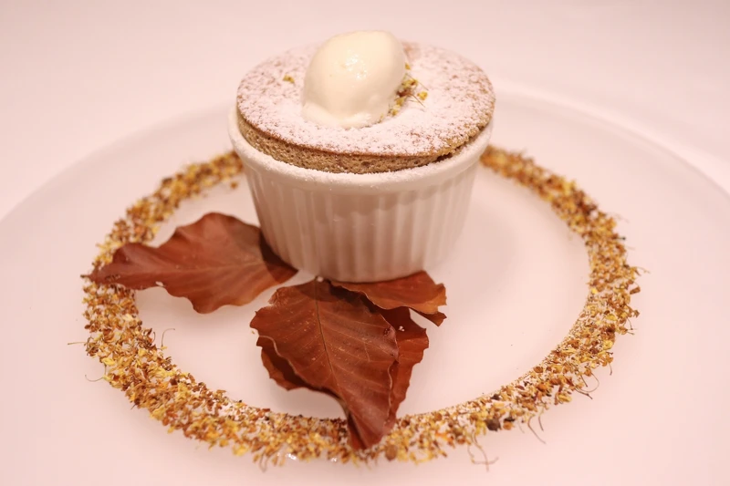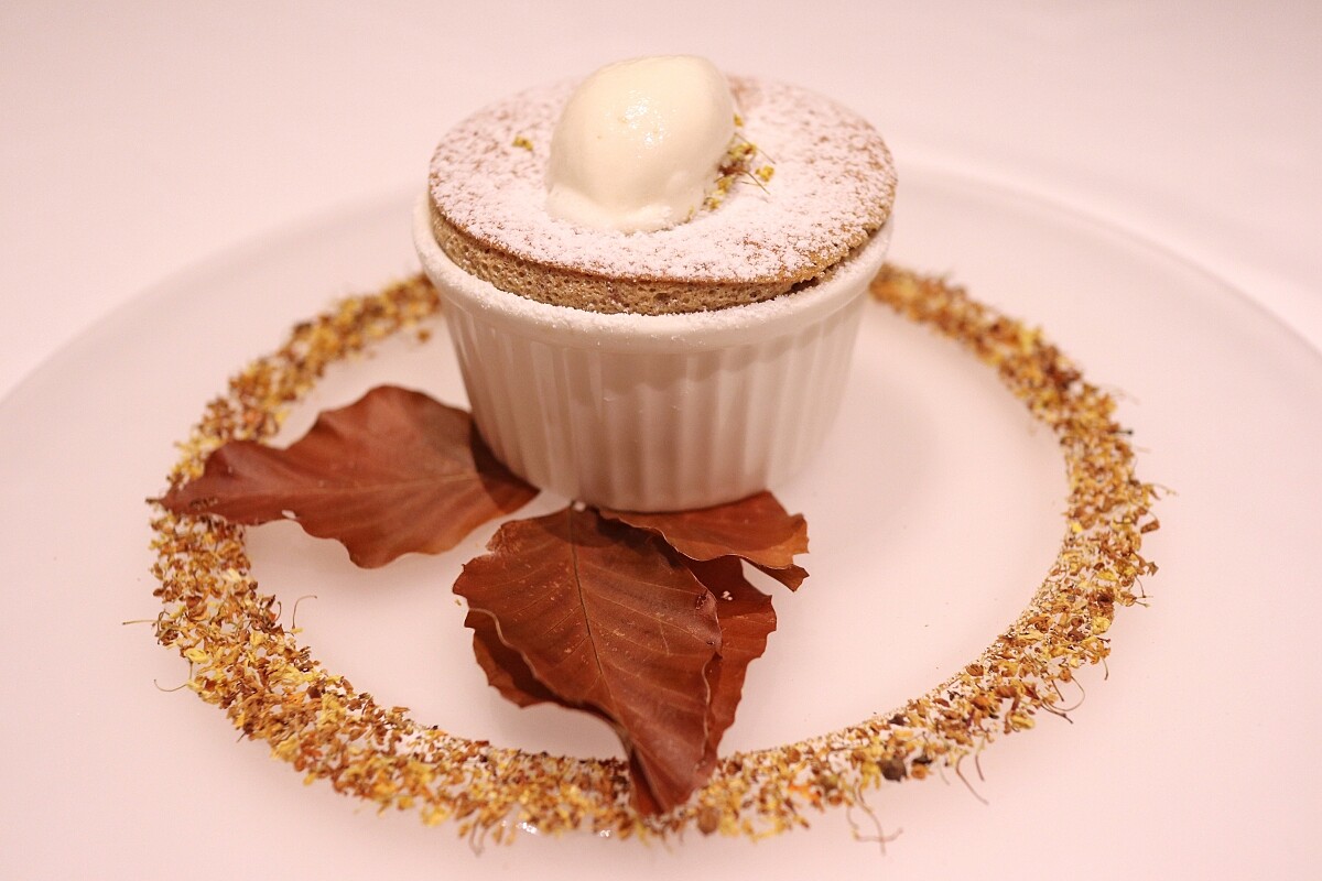 添入烏龍茶、桂花碎烤至蓬鬆,頂上挖上一球相思樹蜂蜜冰淇淋、點綴桂花瓣,冷熱交替的口感,增添秋日優雅香芬。