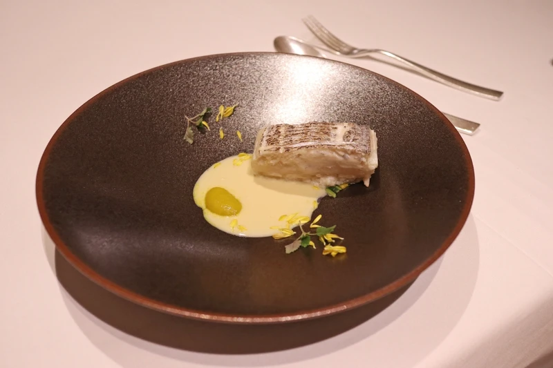 使用秋季肥美的白帶魚,以直火炙燒兩邊魚面,香酥鮮魚表皮,加上以干貝製作柔軟綿密的慕做出口感層次。醬汁用大量清酒加入洋蔥、西芹、山蘿蔔、茵陳蒿、檸檬汁濃縮,最後與鮮奶油調成濃郁醬液,看似含蓄的溫柔醬汁下隱藏著各種爭相出頭的香料風味。配菜為亮麗澄黃的日本小菊 Purée,則是取下180朵日本小菊花葉片熬煮,方能產生140g精華,加入檸檬醬汁更凸顯清爽淡雅。