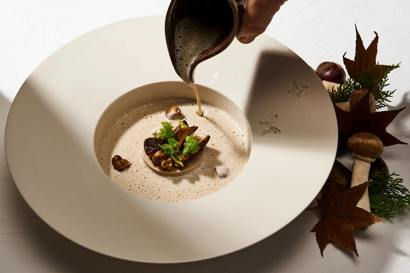 此次秋季菜單中 Chef Xavier 為營造森林的畫面與氣味,透過秋季盛產的栗子、蕈菇風味創造季節感,主菜則用上最具代表的季節食材鴨肉呈現,甜點則有「法朋」李依錫主廚設計甜點共同創造出秋日盛宴。