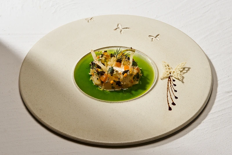 以真鯛做成的生魚片拌入蒔蘿、茴香、鮮橙與蘋果,除了賦予風味也給予口感層次,最後擺在薄荷油上,點綴上魚子醬,一旁則有蝴蝶造型的脆餅、巴薩米克醋能一起享用,此道料理以草本的清新滋味帶出魚肉的鮮美芬芳。