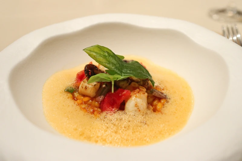 來自西班牙海鮮燉飯為靈感,選用最高等級的 Arroz Bomba 圓米,搭配龍蝦、雞、蔬菜番紅花三種高湯燉煮,一旁點綴上有蔬菜、番紅花風味的泡泡,最後放上直火炙燒的章魚與西班牙臘腸,解構了西班牙海鮮燉飯,組合成全新風貌的歐陸料理經典風味。