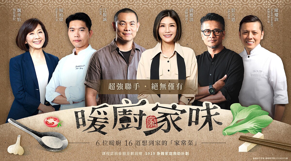為家人做菜,就是傳遞溫暖與愛!「暖廚家味」發起人蔣雅淇匯聚史上最高等級師資團隊,包括被譽為「印度洋上最偉大廚師」RAW 主廚江振誠、南台灣最難預約 AKAME 主廚彭天恩、台中最美餐廳飛花落院主理人魏幸怡、東岸最紅法餐Sinasera 24主廚楊柏偉、蛋黃酥界佼佼者陳耀訓,發起人及五位暖廚攜手十二位家人,在得獎導演以十人團隊搭配八台攝影機的捕捉之下,推出最高規格也最溫暖的線上課程!用隨手可得的食材,家裡就有的設備,全套課程原價$6800募資期只要NT$2,919,就能把主廚們16道家常菜一次學會!認捐者能拿到全額抵稅收據,認捐收入全數捐贈「1919急難家庭救助計劃」,讓餐桌上的溫暖,立刻成為急難家庭的支柱!