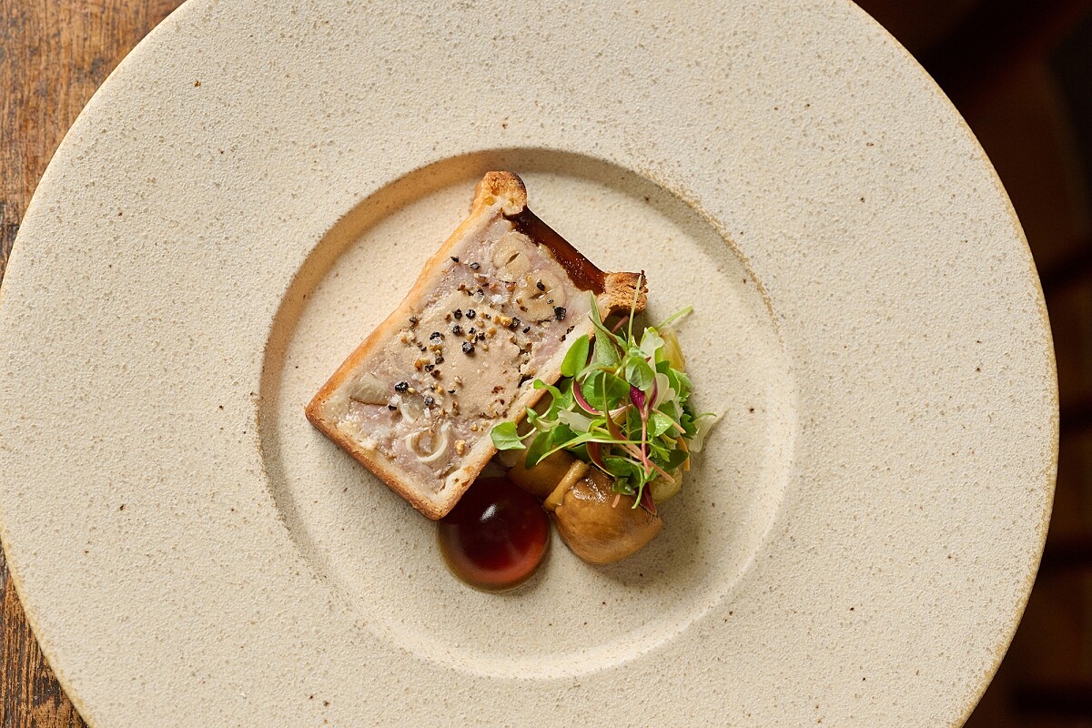熟悉小樂沐的饕客不難發現,Chef Raymond 對「法式肉派(Pâté en croût)」向來情有獨鍾。「法式肉派是最能代表我西餐學習原點的一道菜。」對他來說,從教科書版本至今,Raymond 一路改良,這才領悟到經典菜的延展空間。 傳統的法式肉派中,會在豬肉餡料中加入內臟與堅果,此次同樣以豬肉為餡料基底,再加上以煙燻湖南臘腸方式去製作的豬耳朵,因此用花生取代堅果,再搭配柚子、小香草與花生泥。料理為我們熟悉的經典法式樣貌與風味,但是吃下後卻有著熟悉的台灣內臟、醃漬肉品的風味,加上花生的堅果油滋,成功的轉換了這道經典菜品,令人驚艷。