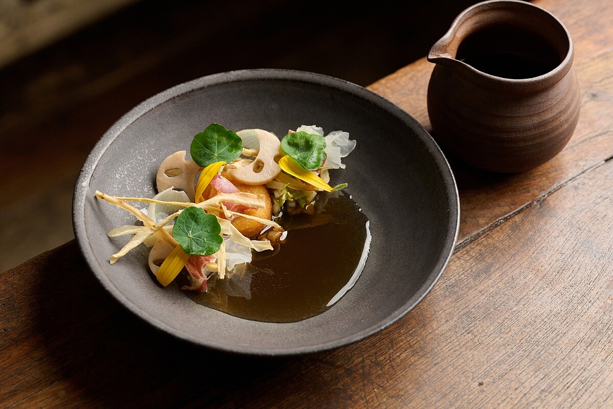 這道菜的靈感來自法國傳統蔬菜燉肉鍋(pot-au-feu),傳統做法是將大量根莖類蔬菜與豬肉、培根共同燉煮,一鍋有肉有菜,還能喝湯,主廚藉著這道菜強調蔬菜與湯的組合,再加上油脂提升整體香味。 主廚以豆腐、蛋白吊出澄清蔬菜湯底,再取出湯中的蓮藕、牛蒡、菱角、菊芋、舞姑等蔬菜個別調理與調味,讓每樣蔬菜都有機會展示它的風味與口感;蔬菜湯則再加入伊比利火腿與煙燻豬背油,讓蔬菜湯喝來更加溫潤順口。