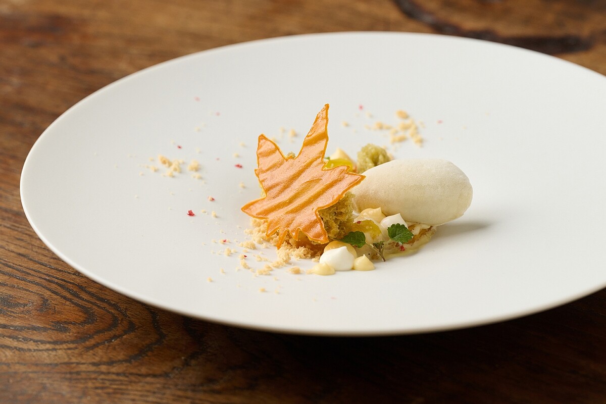 未來會是什麼光景?相信誰也無法預料,但可以確定的是,不管世界如何變化,最重要的是對於家鄉味的認同。若問 Steve 為何回台灣?他的答案就是:「想家了。」 第一道甜點即將鳳凰酥元素拆解,以八角、紅胡椒等香料燉煮的鳳梨為基底。搭以鹹蛋黃製作的卡士達;另外將玉米製成泥,並將玉米梗與皮加以炭烤後,投入牛奶一起煮,讓甜玉米冰淇淋帶有自然的熏烤香氣,最後再淋上白蘭地冷露與無花果葉油,酸甜滋味令人意猶未盡。
