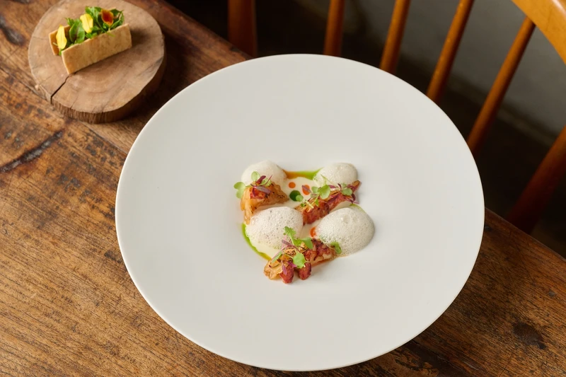 「關懷環境 珍惜當下」一直是 Chef Steve 的料理精神。在台灣人大啖美國龍蝦時,其實在地球的另一頭,為了維護海洋資源永續,美國正進行管控龍蝦捕撈。 此道料理將主要食材龍蝦發揮到極致,運用潮汕生醃海鮮的方式,投以紹興酒、醬油與味醂,再炭烤至七分熟,滋味甘洌香醇;挑選略帶鹹鮮味的朗格爾起司做成奶醬,再以羅勒油和蝦油提味,與醬料共冶後,又是一番滋味。 剩餘的螯肉也不浪費,主廚以在澳洲學藝時,最喜歡的街頭國民小吃「Chiko Roll」為發想,它是以酥皮捲入香腸內餡的「澳式春捲」;他將龍蝦螯肉、豬肉與香菇、蝦米做成餡料,搭配千層酥皮,是台灣人熟悉的滋味。