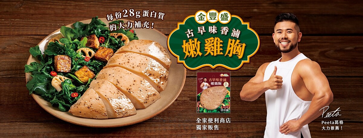金豐盛於 2022 年底推出由Peeta 葛格代言的〈秘香椒麻嫩雞胸〉,以 120 公克大份量圈住許多健身族群的心,口味更是好評不斷。此次再與 Peeta 葛格攜手,推出台系口味的〈古早味香滷嫩雞胸〉,以大家最熟悉的醬油為基底,打造最家常、耐吃的風味,彷彿是小時候下課回到家,最常聞到的那一鍋滷味香氣,能勾起滿滿的食慾。軟嫩的雞胸肉冷藏拆封即可食用,微波加熱後香氣更加乘;不只適合搭配地瓜或沙拉,鹹香的氣息,搭配燙青菜和乾麵,是更日常、也兼顧營養均衡的組合,讓每天的健身餐有更多變化。