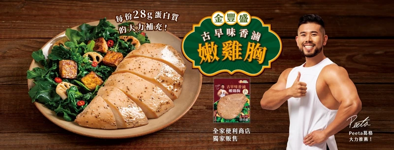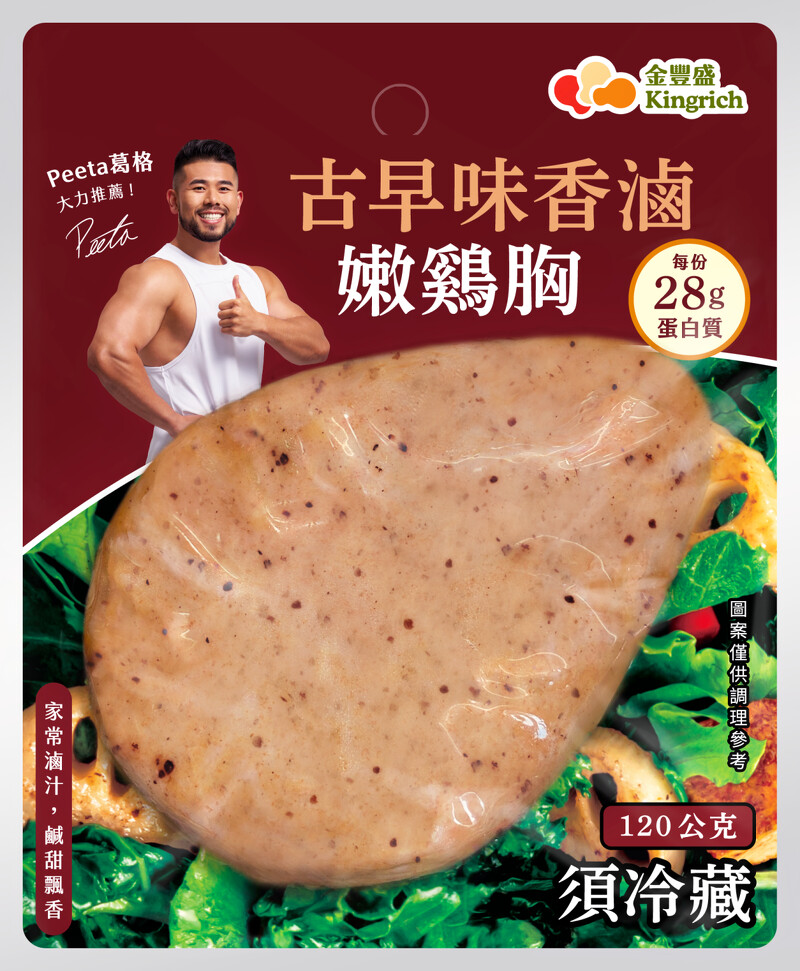金豐盛於 2022 年底推出由Peeta 葛格代言的〈秘香椒麻嫩雞胸〉,以 120 公克大份量圈住許多健身族群的心,口味更是好評不斷。此次再與 Peeta 葛格攜手,推出台系口味的〈古早味香滷嫩雞胸〉,以大家最熟悉的醬油為基底,打造最家常、耐吃的風味,彷彿是小時候下課回到家,最常聞到的那一鍋滷味香氣,能勾起滿滿的食慾。軟嫩的雞胸肉冷藏拆封即可食用,微波加熱後香氣更加乘;不只適合搭配地瓜或沙拉,鹹香的氣息,搭配燙青菜和乾麵,是更日常、也兼顧營養均衡的組合,讓每天的健身餐有更多變化。